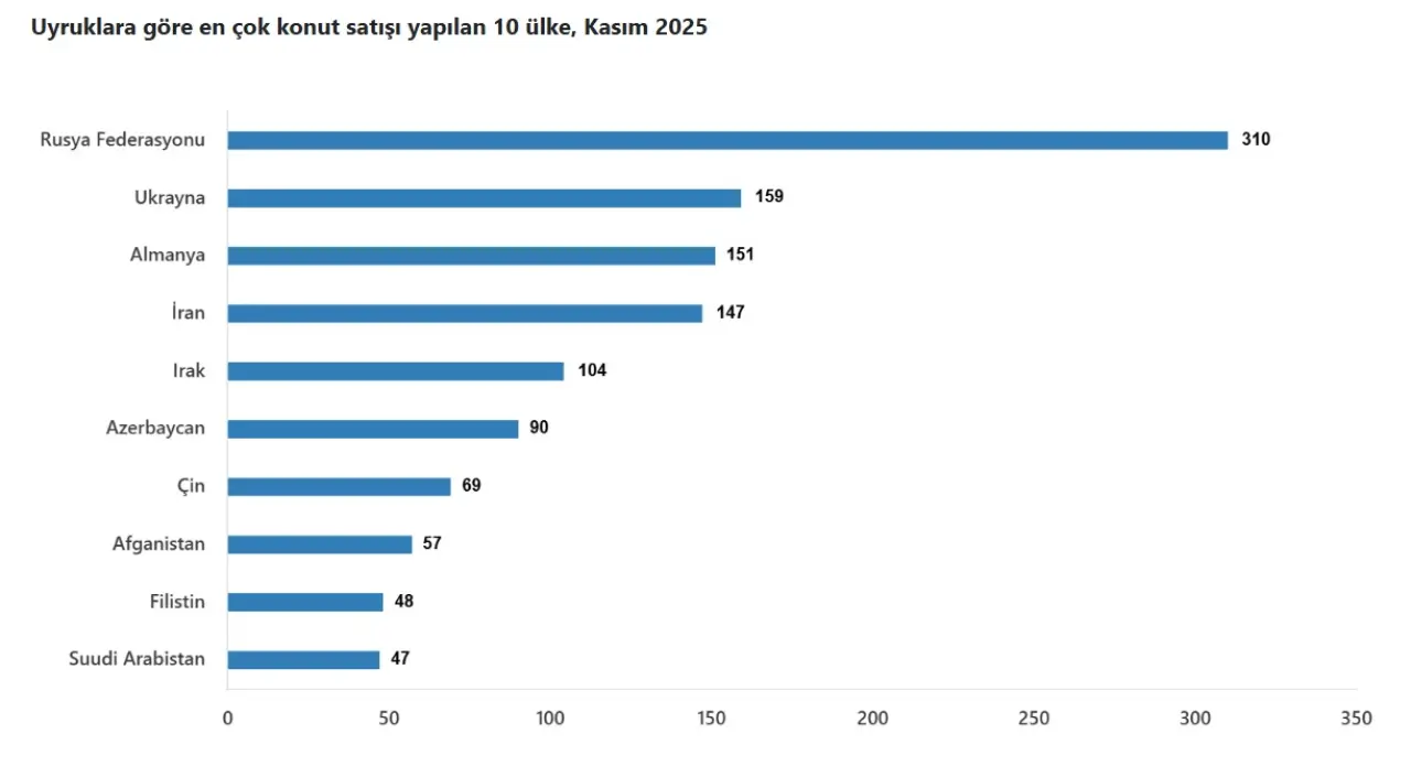 Yabancılara yapılan konut satışları Kasım ayında %9,7 azalarak 1.943 oldu. Toplam satışlar içindeki pay %1,4 seviyesinde kaldı. En fazla satış yapılan iller İstanbul, Antalya ve Mersin olarak sıralandı. Ocak-Kasım döneminde yabancılara yapılan toplam konut satışı ise %11,1 düşüşle 18 bin 993 olarak gerçekleşti. Kasım ayında uyruklara göre en fazla konut satışı Rusya Federasyonu, Ukrayna ve Almanya vatandaşlarına yapıldı.