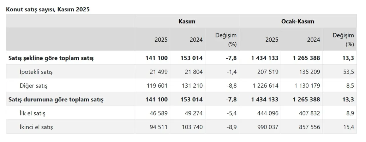 Kasım ayındaki gerilemeye rağmen, yılın genelinde konut satışlarında yukarı yönlü bir seyir dikkat çekiyor. Özellikle ipotekli ve ikinci el satışlardaki artış, piyasada talebin tamamen zayıflamadığını gösterirken; yabancıya satışlardaki düşüş, konut piyasasının ağırlıklı olarak iç talep tarafından şekillendiğine işaret ediyor.