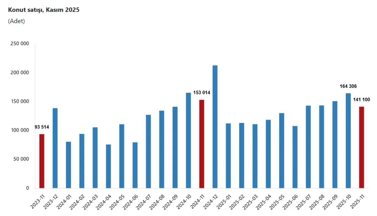 Türkiye genelinde konut satışları, Kasım 2025’te geçen yılın aynı ayına göre %7,8 azalarak 141 bin 100 olarak gerçekleşti. Aylık bazdaki gerilemeye karşın, Ocak–Kasım döneminde konut satışları %13,3 artışla 1 milyon 434 bin 133’e ulaştı. Bu tablo, yıl genelinde konut piyasasında toparlanma eğiliminin sürdüğünü gösterdi. Kasım ayında konut satışlarının en yoğun gerçekleştiği iller 24 bin 234 ile İstanbul, 12 bin 706 ile Ankara ve 8 bin 540 ile İzmir oldu. En az satış yapılan iller ise Ardahan, Bayburt ve Artvin olarak kayıtlara geçti.
