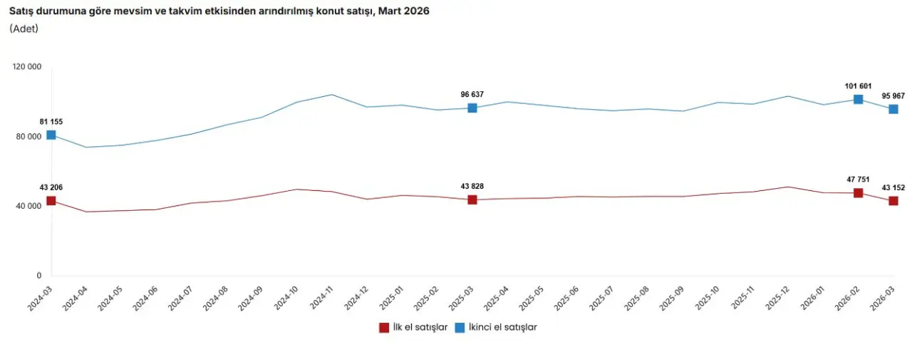 Mevsim ve takvim etkilerinden arındırılmış verilere göre hem ilk el hem de ikinci el konut satışlarında aylık bazda düşüş görüldü. Bu durum, piyasada talebin zayıfladığına işaret ediyor. Mart ayı verileri, konut piyasasında toplam satışların yatay seyrettiğini ancak finansman kaynaklı satışların öne çıktığını gösteriyor. İpotekli satışlardaki artış dikkat çekerken, yabancı talebindeki düşüş ve ikinci el piyasadaki daralma, sektörün kırılgan yapısını koruduğunu ortaya koyuyor.