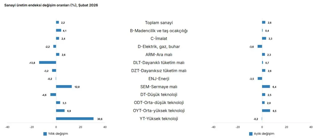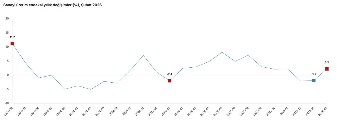Türkiye’de sanayi üretimi şubat ayında hem aylık hem de yıllık bazda artış gösterdi ancak büyümenin kompozisyonu dikkat çekici bir ayrışmaya işaret etti. Türkiye İstatistik Kurumu (TÜİK) verilerine göre sanayi üretim endeksi yıllık bazda yüzde 2,2 artarken, aylık artış yüzde 2,6 olarak gerçekleşti. Veriler, kısa vadede üretimde toparlanma sinyali verirken, yıllık bazda büyümenin sınırlı kaldığını ortaya koydu.