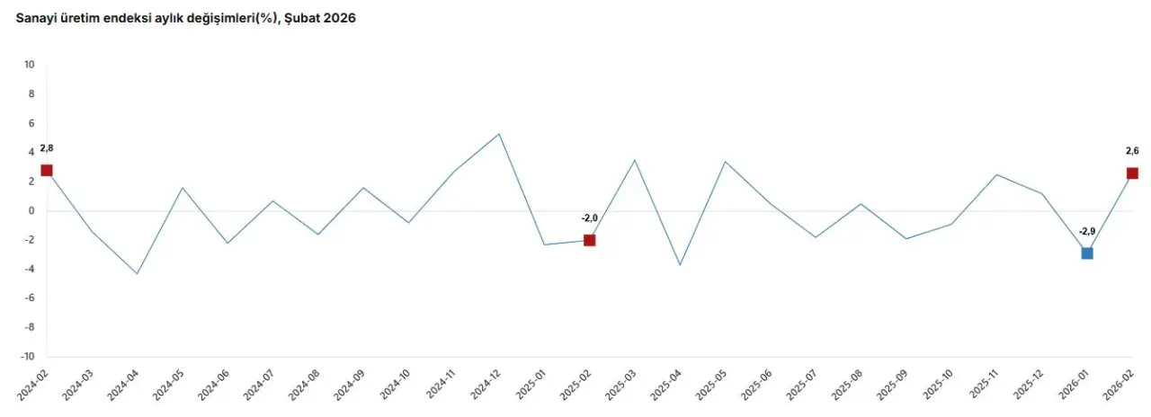 Şubat ayında sanayi üretimi bir önceki aya göre yüzde 2,6 artarak daha güçlü bir performans sergiledi. Alt sektörlerde: