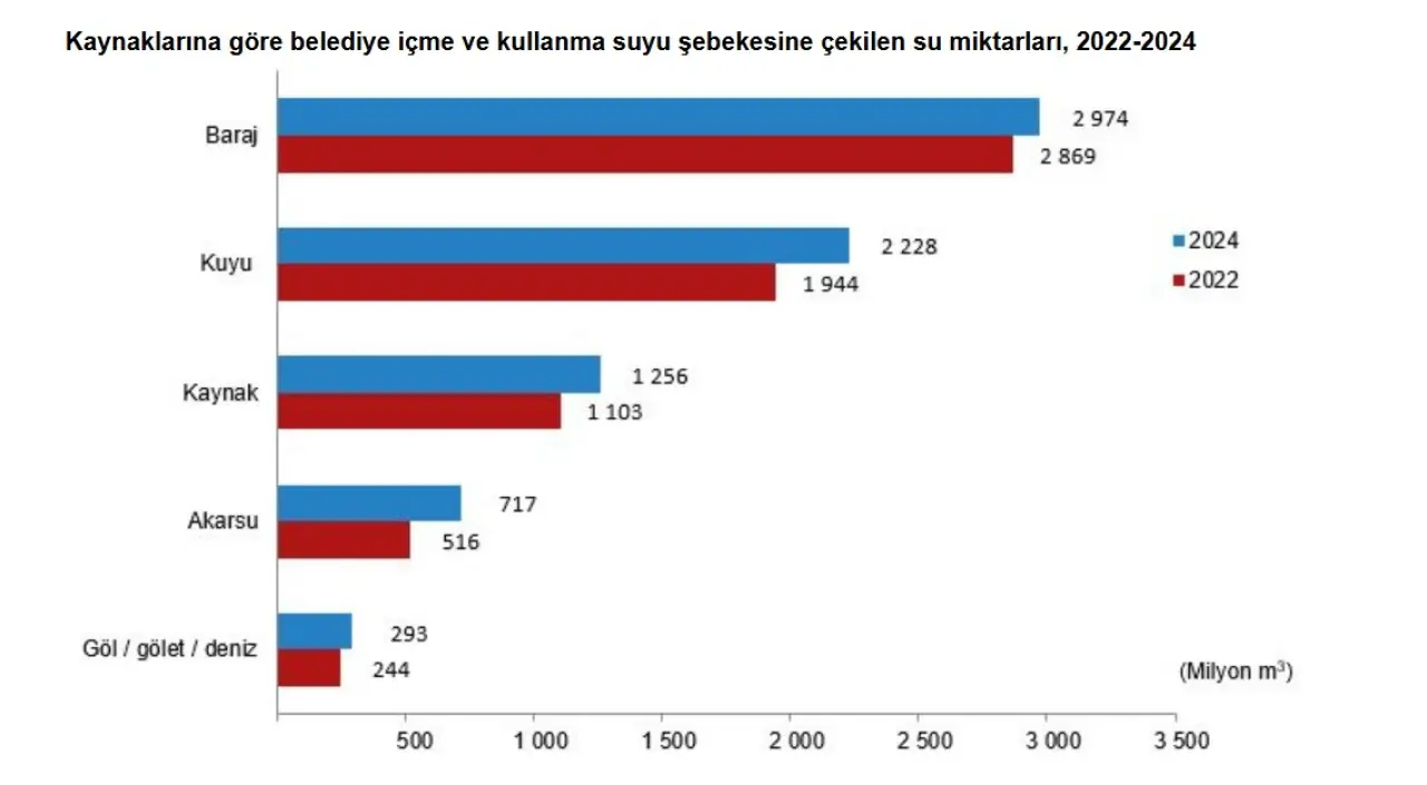 Türkiye İstatistik Kurumu’nun (TÜİK) yayımladığı 2024 Su ve Atıksu İstatistikleri, Türkiye’de su kullanımının arttığını, atıksu yönetiminde ise arıtma kapasitesinin güçlendiğini ortaya koydu. Belediyelerden sanayi tesislerine, termik santrallerden OSB’lere kadar geniş bir yelpazede yürütülen araştırma, ülkede 2024 yılında su kaynaklarından 20,3 milyar metreküp su çekildiğini gösterdi. Bu rakam, 2022’ye göre yaklaşık 1,1 milyar m³’lük artışa işaret ediyor.