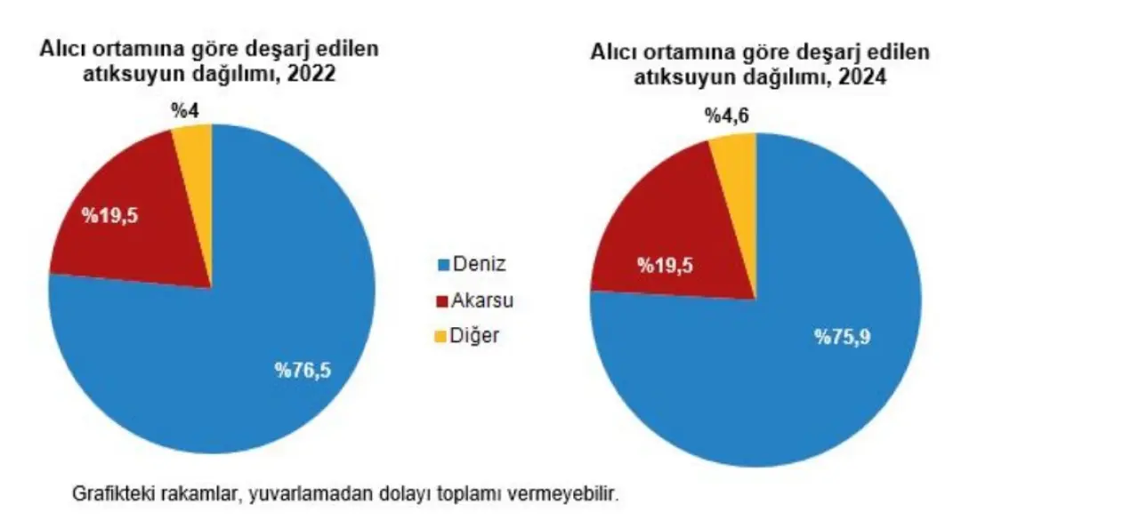 2024 yılında belediyeler, sanayi tesisleri, termik santraller, OSB'ler ve köyler tarafından 17,2 milyar m³ atıksu doğrudan alıcı ortamlara deşarj edildi. Atıksuyun alıcı ortam dağılımı: