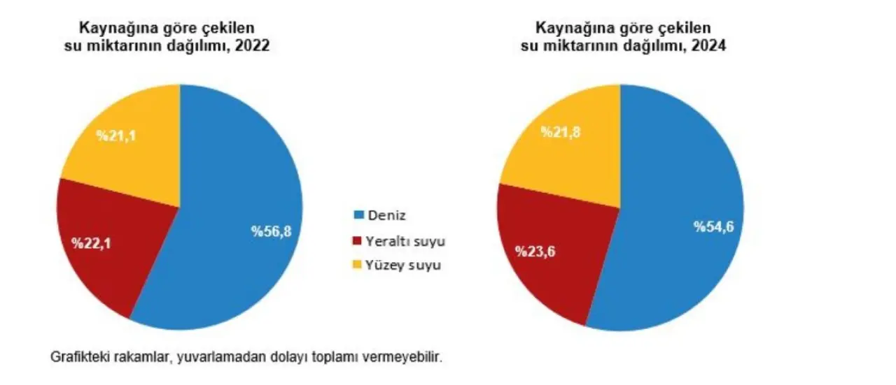 2024 yılında su çekiminin %54,6’sı denizlerden, %45,4’ü ise tatlı su kaynaklarından sağlandı. Tatlı suyun kullanım dağılımı şöyle gerçekleşti: