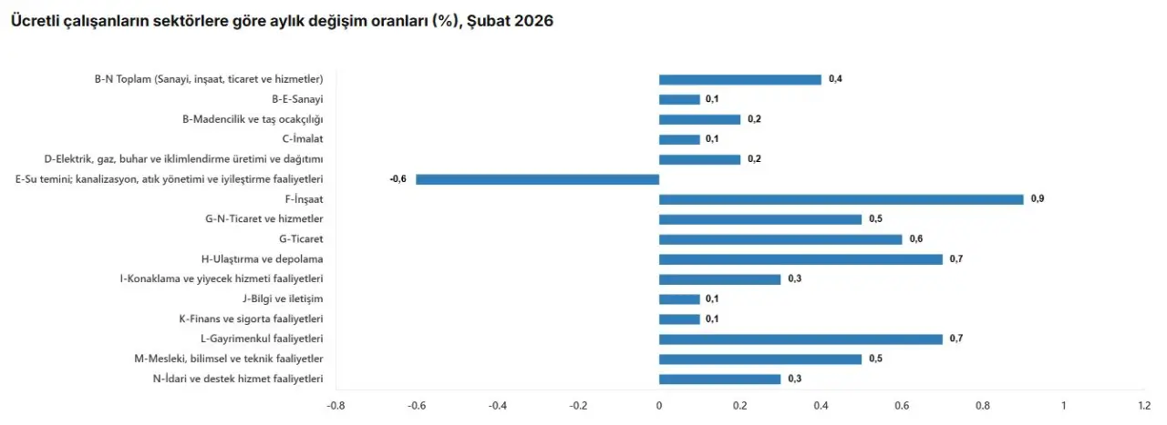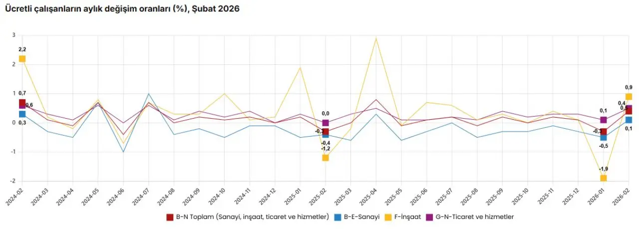 Şubat ayında ücretli çalışan sayısı bir önceki aya göre yüzde 0,4 artış gösterdi. Bu dönemde inşaat sektörü yüzde 0,9 ile aylık bazda en hızlı artışı kaydederken, ticaret-hizmet sektörü yüzde 0,5, sanayi sektörü ise yüzde 0,1 artış gösterdi. Aylık veriler, istihdam piyasasında kademeli bir toparlanmaya işaret etti.