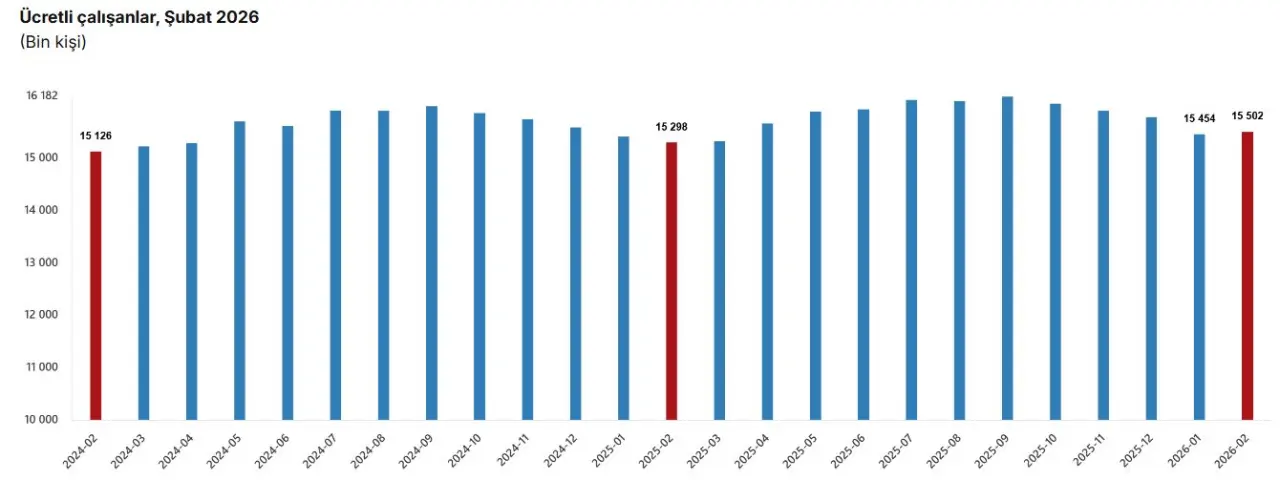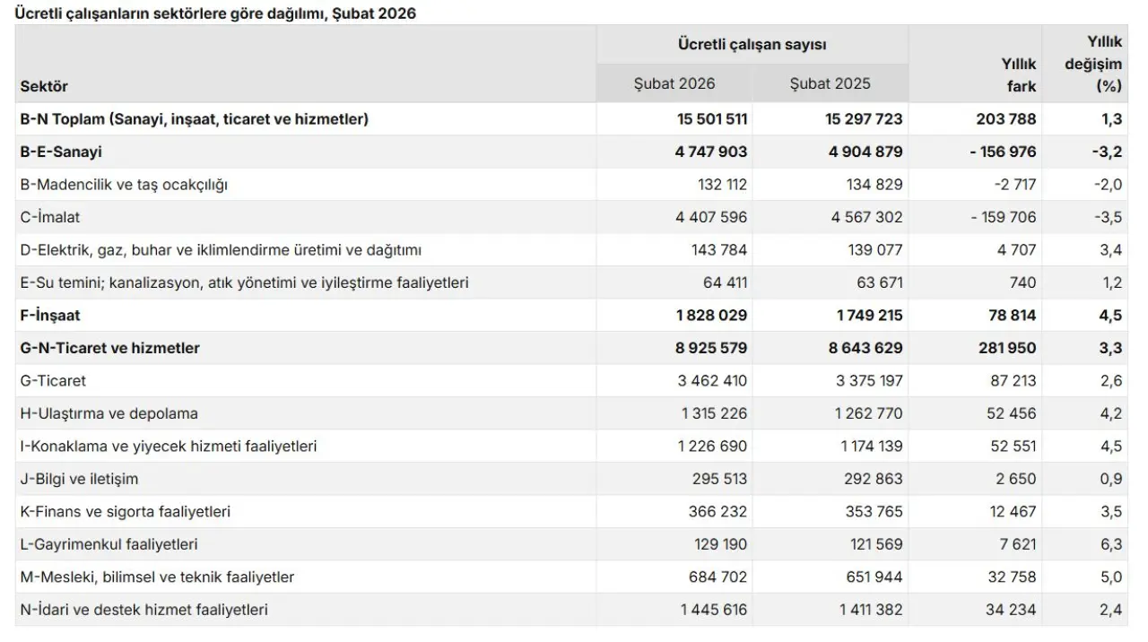 Sanayi, inşaat ve ticaret-hizmet sektörleri toplamında ücretli çalışan sayısı, 2026 yılı şubat ayında geçen yılın aynı ayına göre yüzde 1,3 artarak 15 milyon 501 bin 511 kişiye ulaştı. Bir önceki yıl aynı dönemde bu sayı 15 milyon 297 bin 723 seviyesindeydi. Bu artış, istihdam piyasasında sınırlı ancak istikrarlı bir genişlemeye işaret etti.