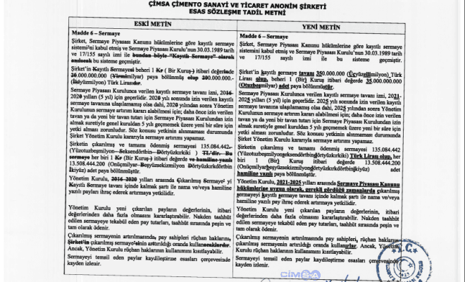 Çimsa Çimento tarafından yapılan açıklama ve esas sözleşme tadil metni aşağıdaki gibidir: