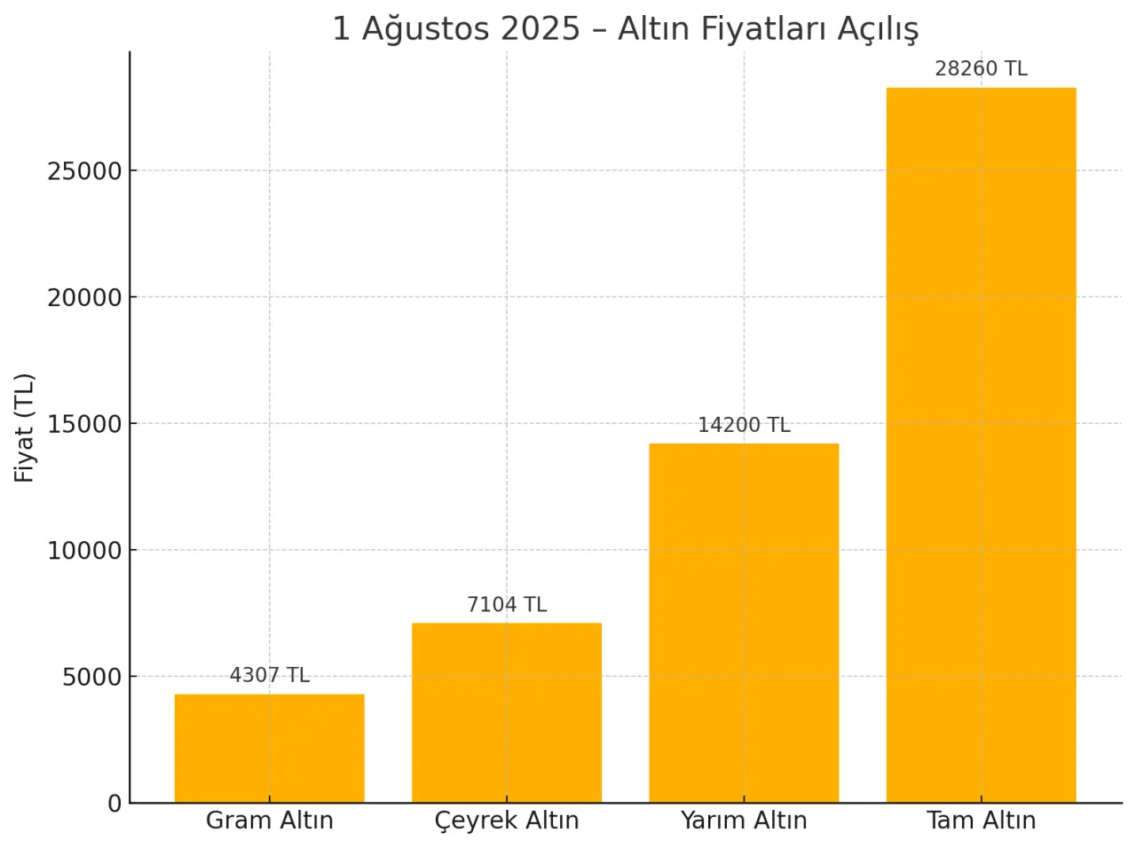 1 Ağustos sabahında altın piyasaları yukarı yönlü açıldı. Gram altın 4.307 TL, çeyrek altın ise 7.104 TL'den işlem görüyor. Gün yeni başlarken güvenli liman talebi yeniden hız kazandı