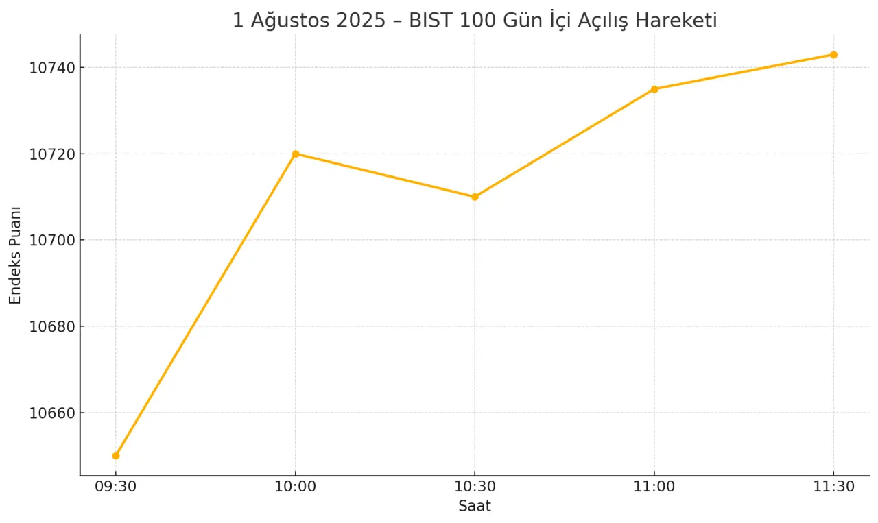 Yeni ayın ilk işlem gününde Borsa İstanbul’da pozitif bir açılış gerçekleşti. BIST 100 endeksi, güne 10.650 puan seviyelerinde başlayarak sabah saatlerinde alıcılı seyir izledi. Endeksin gün içi en düşük seviyesi 10.640 puan olurken, en yüksek seviye 10.747 puana kadar ulaştı. Açılış itibarıyla endeks yüzde 1,1’in üzerinde prim yaptı.