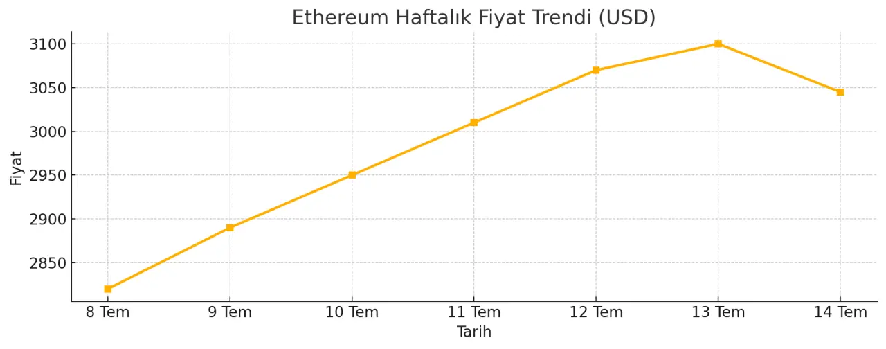 Ethereum 3 045 dolar civarında işlem görürken, haftalık bazda yüzde 8’lik yükseliş kaydetti. Blok zinciri uygulamalarıyla entegrasyon, yüksek staking hacimleri ve kurumsal benimseme, ETH’nin toparlanan grafiklerini destekliyor.