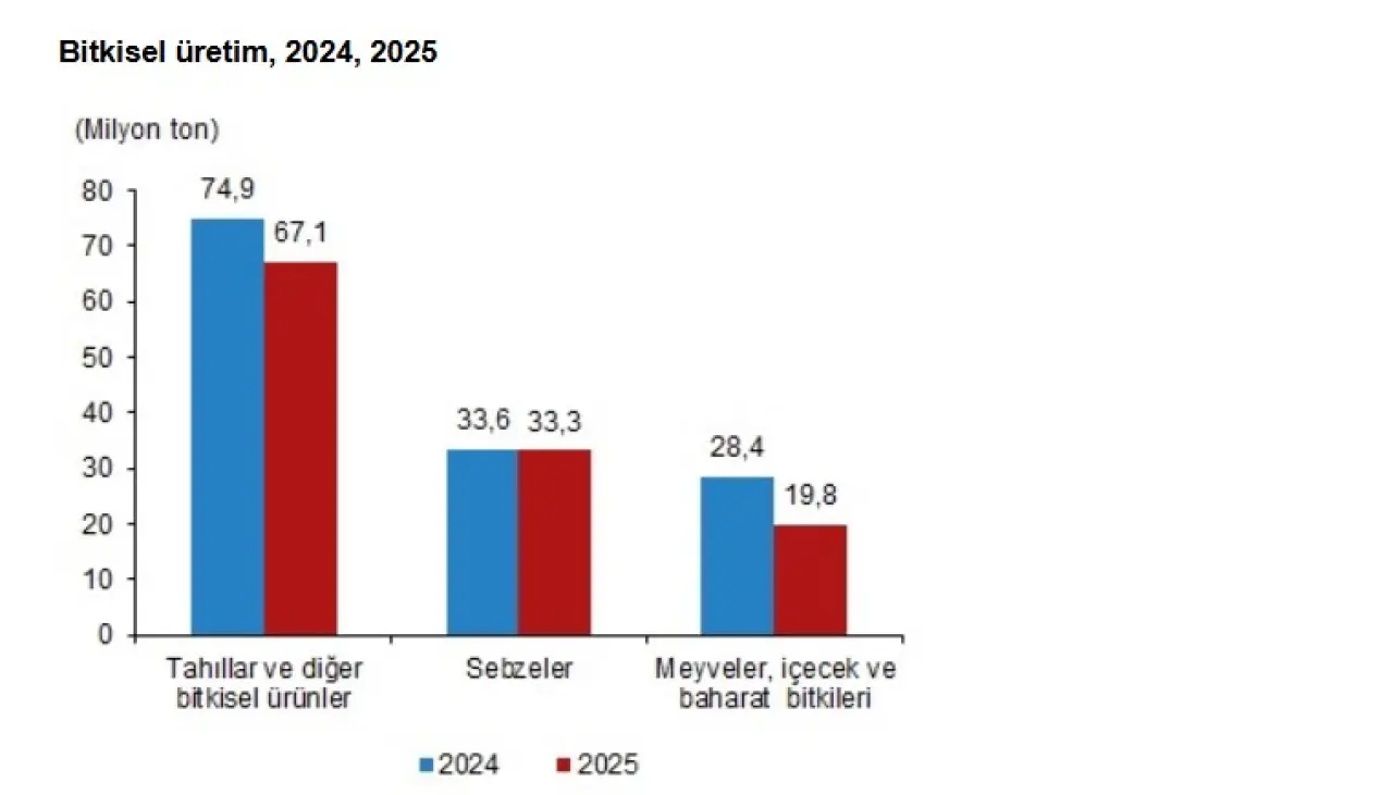 2025 yılı tahıl üretiminin %12,4 oranında azalarak 34,2 milyon tona gerilemesi bekleniyor. Öne çıkan kalemler şöyle:
