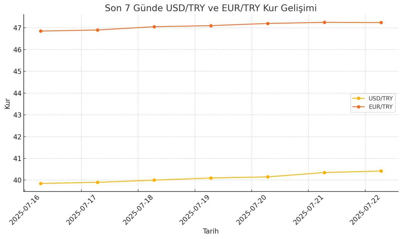 Döviz piyasaları haftaya sınırlı hareketlerle başladı. 22 Temmuz sabahında dolar/TL 40,42 seviyesine yükselerek haftanın ilk saatlerinde yukarı yönlü bir eğilim sergilerken, euro/TL 47,24 bandında yatay seyrediyor. Yurt içi piyasalar temkinli görünümünü korurken, yatırımcılar gözünü dış gelişmelere ve Merkez Bankası’nın olası adımlarına çevirdi