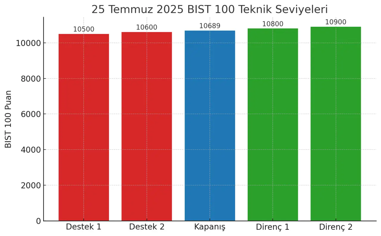 24 Temmuz 2025 kapanışında BIST 100 Endeksi, bir önceki güne göre yüzde 0,92 yükselerek 10.689,05 puandan günü tamamladı. Gün içi fiyat aralığı 10.591,95 – 10.783,10 puan arasında şekillendi. 25 Temmuz sabahı için açılış beklentisi +20 ila +50 puan arasında pozitif yönlü. Endeksin güne yatay–pozitif başlaması, kısa vadeli iyimserliğin korunduğuna işaret ediyor.