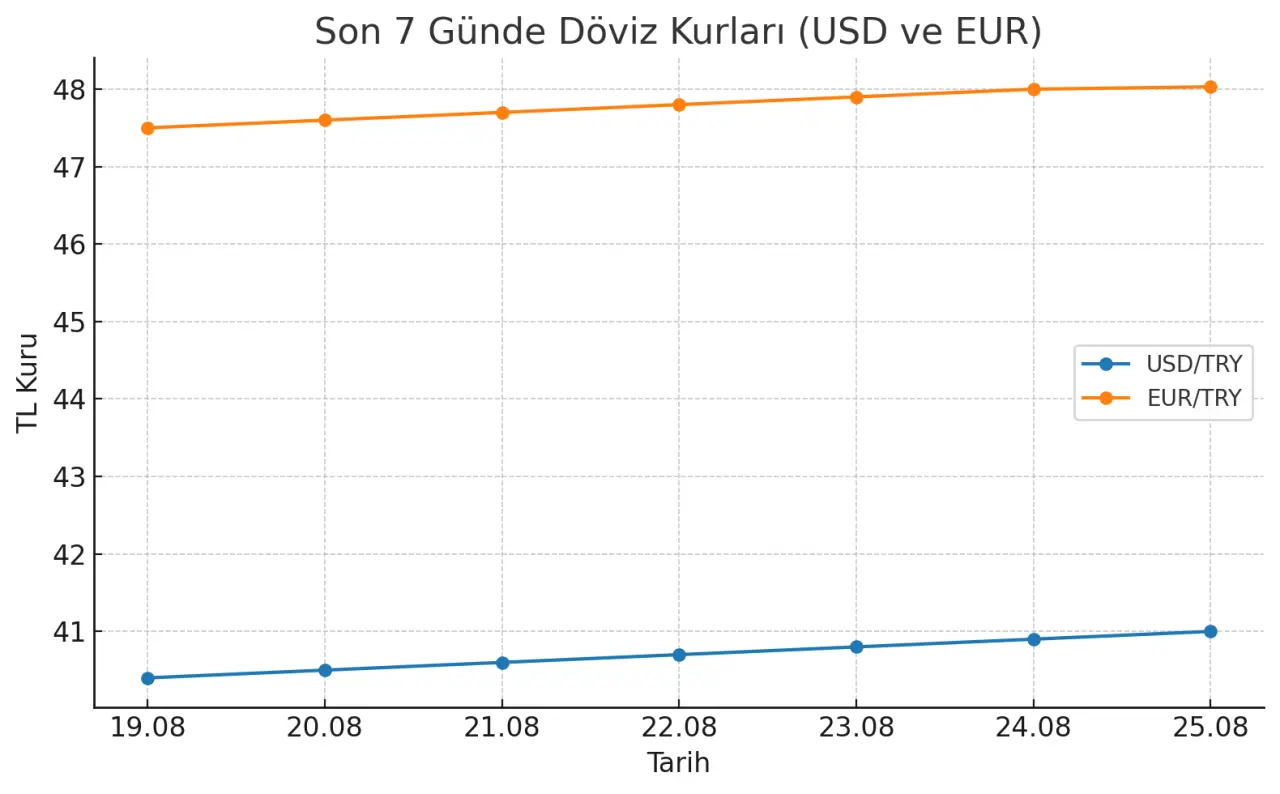 USD/TRY: Amerikan Doları, haftanın ilk gününde yükselişini sürdürerek yaklaşık 41,00 TL seviyelerine ulaştı. EUR/TRY: Euro da benzer şekilde 48,03 TL civarında işlem görüyor. TCMB Kurları: 22 Ağustos verilerine göre USD alış 40,85 TL, USD satış 40,92 TL, EUR alış 47,37 TL, EUR satış 47,45 TL seviyelerinde. Serbest piyasa ile Merkez Bankası kurları arasındaki fark, TL’deki değer kaybını ve piyasadaki arz-talep dengesini net biçimde ortaya koyuyor. Dolar, resmi verilere göre 40,9 TL seviyesindeyken, serbest piyasada 41 TL’ye kadar yükselmiş durumda. 25 Ağustos için USD/TRY kapanış fiyatı 41,00 TL seviyesinde. Bu da bir önceki güne göre yaklaşık yüzde 0,10’luk artış anlamına geliyor.