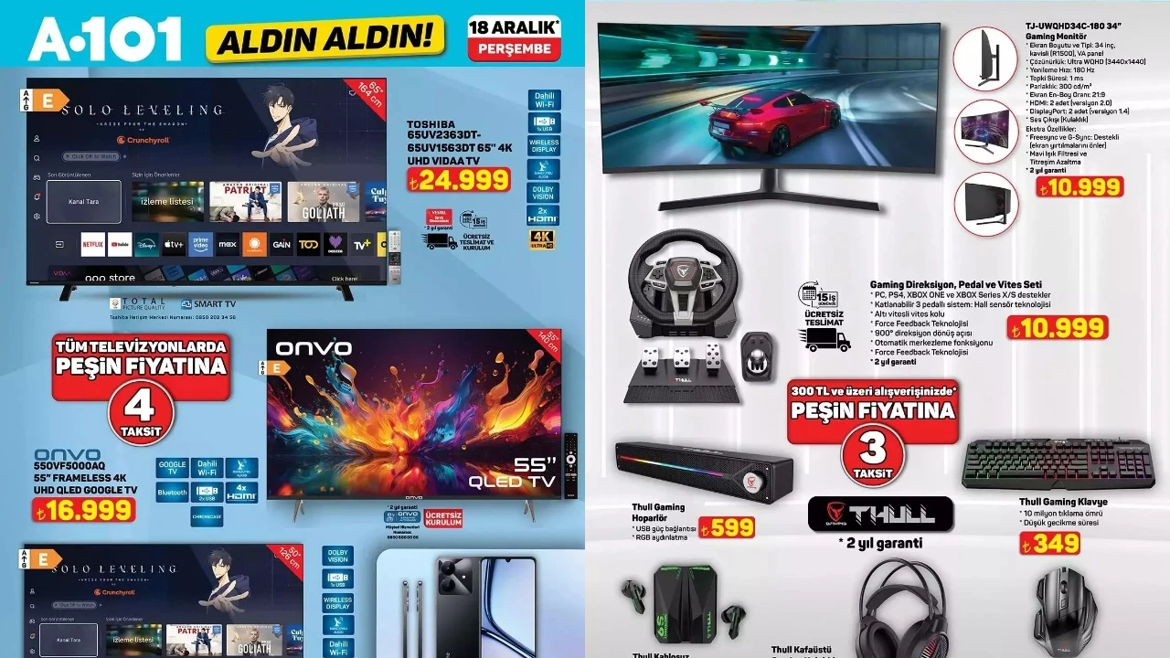 A101’in 18 Aralık 2025 aktüel ürünler kataloğu, geniş ürün yelpazesi ve dikkat çeken fiyatlarıyla yayımlandı. Evini yenilemek isteyenlerden yılbaşı hazırlığı yapanlara kadar birçok tüketiciye hitap eden katalogda; elektronik, beyaz eşya, küçük ev aletleri, ev tekstili, mutfak gereçleri ve oyuncak gruplarında önemli indirimler yer alıyor. Bu haftanın öne çıkan ürünleri arasında televizyon ve cep telefonu seçenekleri dikkat çekiyor: