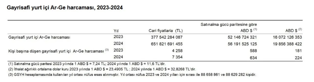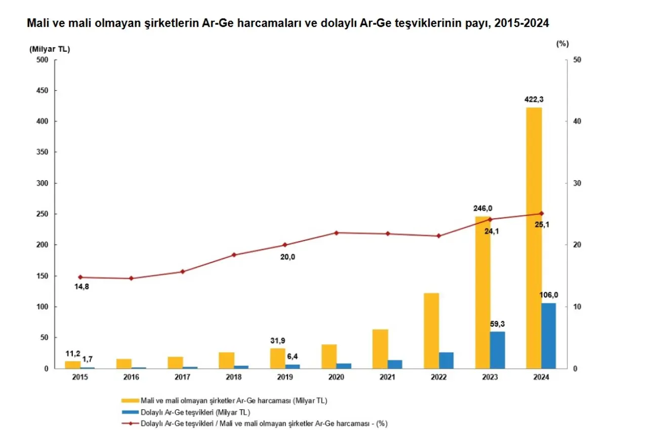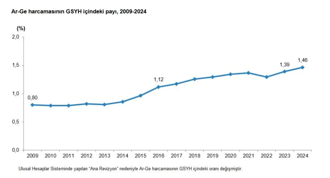 Türkiye’nin araştırma-geliştirme yatırımları 2024’te rekor seviyeye ulaştı. TÜİK verilerine göre, Ar-Ge harcamaları bir önceki yıla göre yüzde 72 artarak 651 milyar 822 milyon TL oldu. Böylece Ar-Ge’nin gayrisafi yurt içi hasıla içindeki payı %1,46’ya yükselerek tüm zamanların en yüksek oranına çıktı
