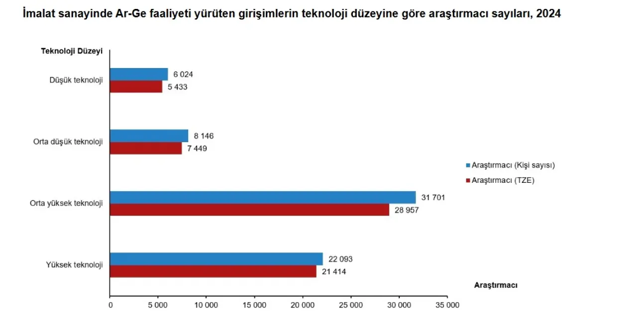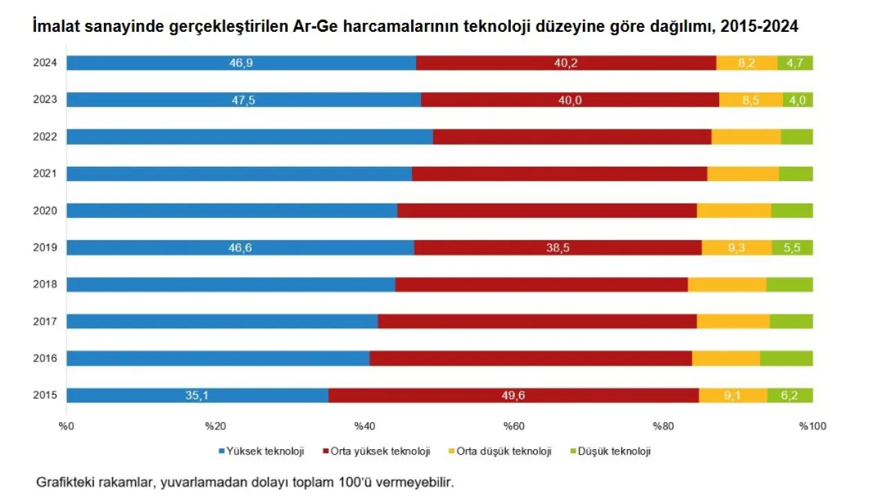 İmalat sanayinde yapılan 210 milyar TL’lik Ar-Ge harcamasının %46,9’u yüksek teknoloji faaliyetlerinde yoğunlaştı. Orta yüksek teknoloji girişimlerinin payı %40,2, düşük teknolojinin payı ise %4,7 oldu. Ar-Ge merkezleri özel sektörün ana üssü haline gelirken, şirketlerdeki Ar-Ge harcamalarının %52,7’si bu merkezlerde gerçekleştirildi. Dolaylı Ar-Ge teşvikleri, özel sektörün Ar-Ge harcamaları içinde %25,1’lik paya ulaştı. 2015’te bu oran yalnızca %14,8 seviyesindeydi. Uzmanlara göre, teşvik oranlarındaki artış Türkiye’nin yenilik ekosistemini büyütürken, özel sektörün araştırma yatırımlarını da hızlandırıyor. Ekonomistler, 2024 verilerinin Türkiye’nin Ar-Ge kapasitesinde güçlü bir ivme yakaladığını, ancak GSYH içindeki payın hâlen OECD ortalamasının altında olduğunu belirtiyor. Yeni ekonomi programında hedef, bu oranı orta vadede %2 seviyesine taşımak.