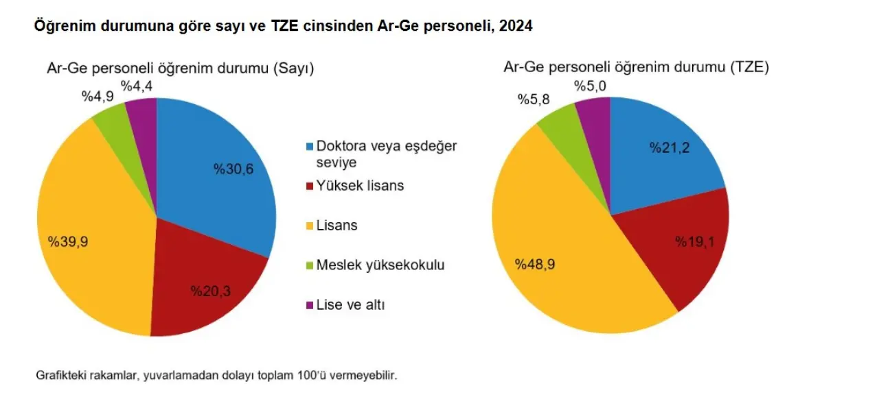 Türkiye’nin araştırma-geliştirme (Ar-Ge) faaliyetlerine ayırdığı kaynak 2024 yılında tarihi seviyeye ulaştı. TÜİK’in açıkladığı verilere göre, gayrisafi yurt içi Ar-Ge harcaması geçen yıla göre %72 artışla 651 milyar 822 milyon TL oldu. Böylece Ar-Ge’nin gayrisafi yurt içi hasıla (GSYH) içindeki payı da %1,46’ya çıkarak tüm zamanların en yüksek oranına ulaştı. Verilere göre Ar-Ge harcamalarının %64,8’i mali ve mali olmayan şirketler tarafından gerçekleştirildi. Şirketleri %30,9 payla yükseköğretim, %4,3 payla genel devlet sektörü izledi. Harcama kalemleri içinde personel giderleri %59,5 ile ilk sırada yer aldı. Finansman tarafında da tablo benzer: Ar-Ge harcamalarının %53,8’i özel sektör, %30,4’ü kamu, %12,9’u yükseköğretim kurumları tarafından karşılandı.