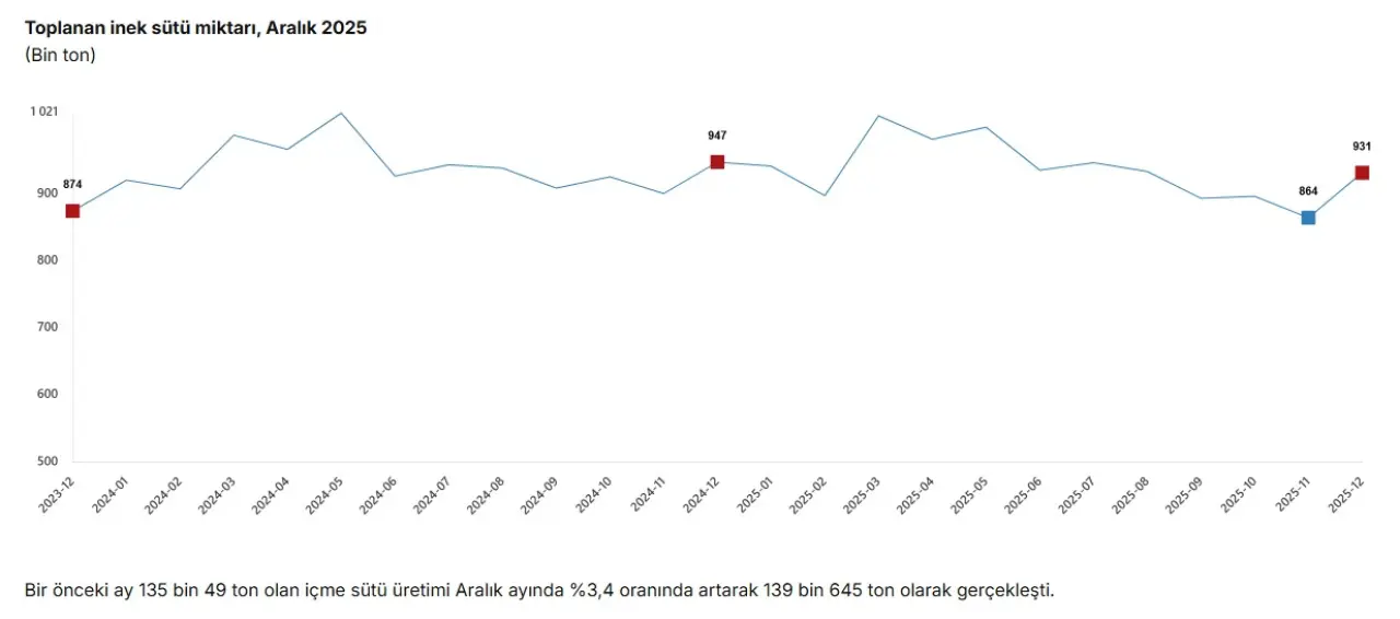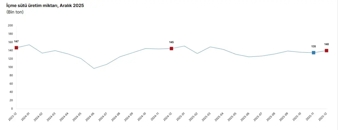 Bir önceki ay 135 bin 49 ton olan içme sütü üretimi, Aralık ayında yüzde 3,4 artarak 139 bin 645 ton olarak gerçekleşti. Yıllık bazdaki gerilemeye rağmen aylık artış, tüketim dinamiklerinde kısa vadeli toparlanmaya işaret etti.