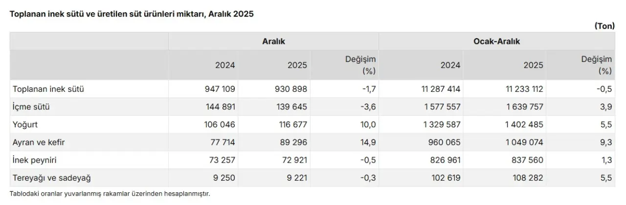 Aralık 2025 süt üretim verileri açıklandı. Ticari süt işletmeleri geçen yılın aynı ayına göre daha az süt toplarken, yoğurt ile ayran-kefir üretiminde güçlü artış dikkat çekti. Toplanan süt miktarı aylık bazda yükselse de yıllık toplamda sınırlı gerileme kaydedildi. Fermente ürünlerdeki ivme, tüketim eğilimlerinde değişimi ortaya koydu