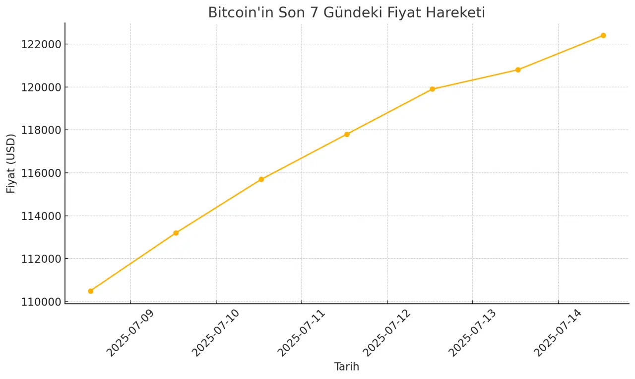 Kripto para piyasalarının öncüsü Bitcoin, 14 Temmuz 2025 itibarıyla 122 bin 400 doları aşarak tarihî zirvesini gördü. Son beş günde yüzde 10’un üzerinde değer kazanan Bitcoin’de yalnızca bugünkü yükseliş yaklaşık yüzde 3 seviyesinde gerçekleşti. Uzmanlar bu hızlı tırmanışın arkasında güçlü ve çok yönlü dinamiklerin bulunduğunu belirtiyor.
