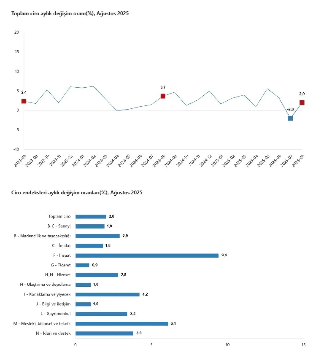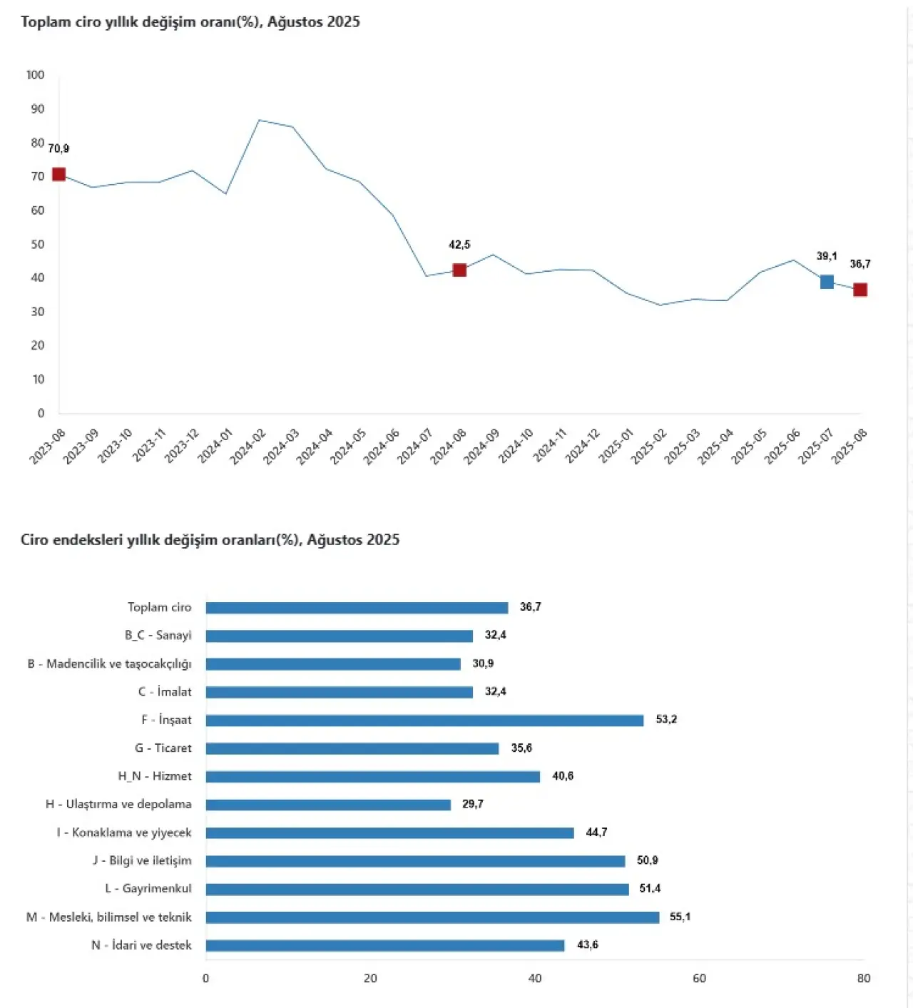 Ağustos ayında en dikkat çekici performans inşaat sektöründe görüldü. Ciro endeksi yıllık bazda %53,2, aylık bazda %9,4 arttı. Kamu yatırımlarındaki hızlanma, kentsel dönüşüm projelerinin genişlemesi ve konut talebindeki canlanma bu yükselişte belirleyici oldu. Sektör, 2025 yaz döneminde ciro artışında lider konuma yükseldi.