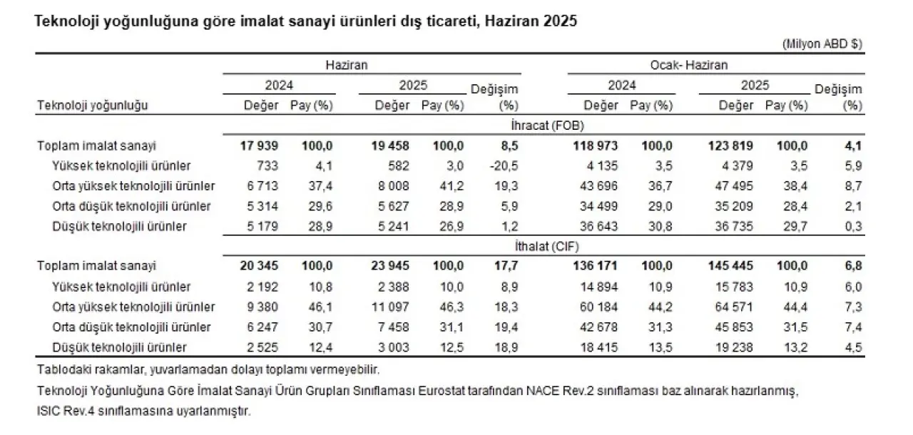 Haziran ayında yüksek teknolojili ürünlerin toplam imalat sanayi ihracatı içindeki payı yüzde 3 oldu. Aynı ürünlerin ithalat içindeki payı ise yüzde 10 düzeyinde gerçekleşti. Bu veriler, Türkiye'nin yüksek katma değerli ürün ihracatında hâlen potansiyelini tam olarak kullanamadığını ortaya koyuyor. Haziran 2025 dış ticaret verileri, Türkiye'nin dış pazarlarda ivmesini koruduğunu ancak ithalat kalemlerindeki artış nedeniyle ticaret dengesinde ciddi bir baskı oluştuğunu gösteriyor. Özellikle ara malı ve enerji bağımlılığının devam etmesi, dış ticaret açığını yapısal olarak artıran başlıca faktörlerden biri olmaya devam ediyor.