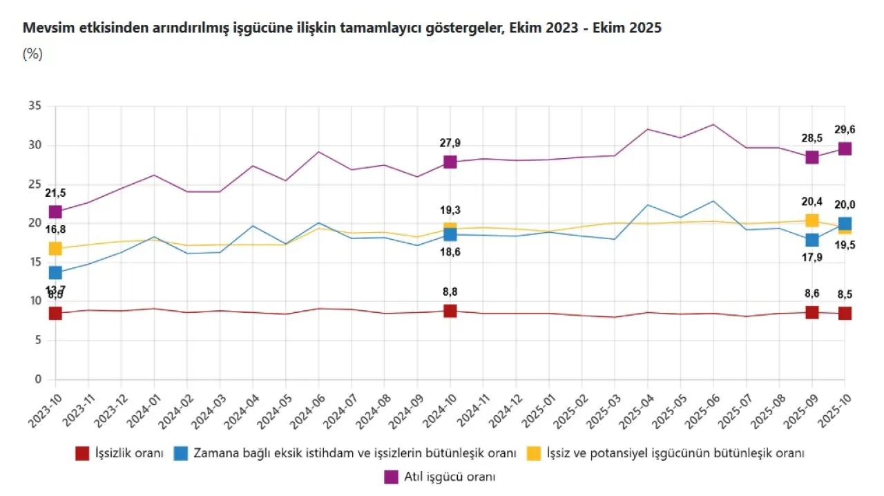 Ekim ayında, istihdamda yer alan ve işbaşında olanların mevsim ve takvim etkilerinden arındırılmış haftalık ortalama fiili çalışma süresi 0,7 saat azalarak 42,2 saat olarak hesaplandı. Bu düşüş, üretim temposundaki hafif yavaşlamaya işaret eden bir gösterge olarak değerlendiriliyor. Zamana bağlı eksik istihdam, potansiyel işgücü ve işsiz bireylerden oluşan atıl işgücü oranı, Ekim ayında önemli bir yükseliş göstererek yüzde 29,6 seviyesine ulaştı. Alt kırılımlar şöyle gerçekleşti: