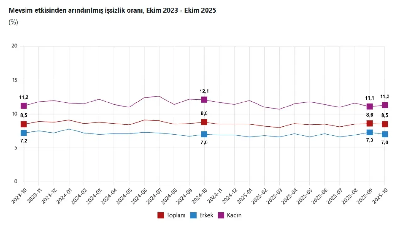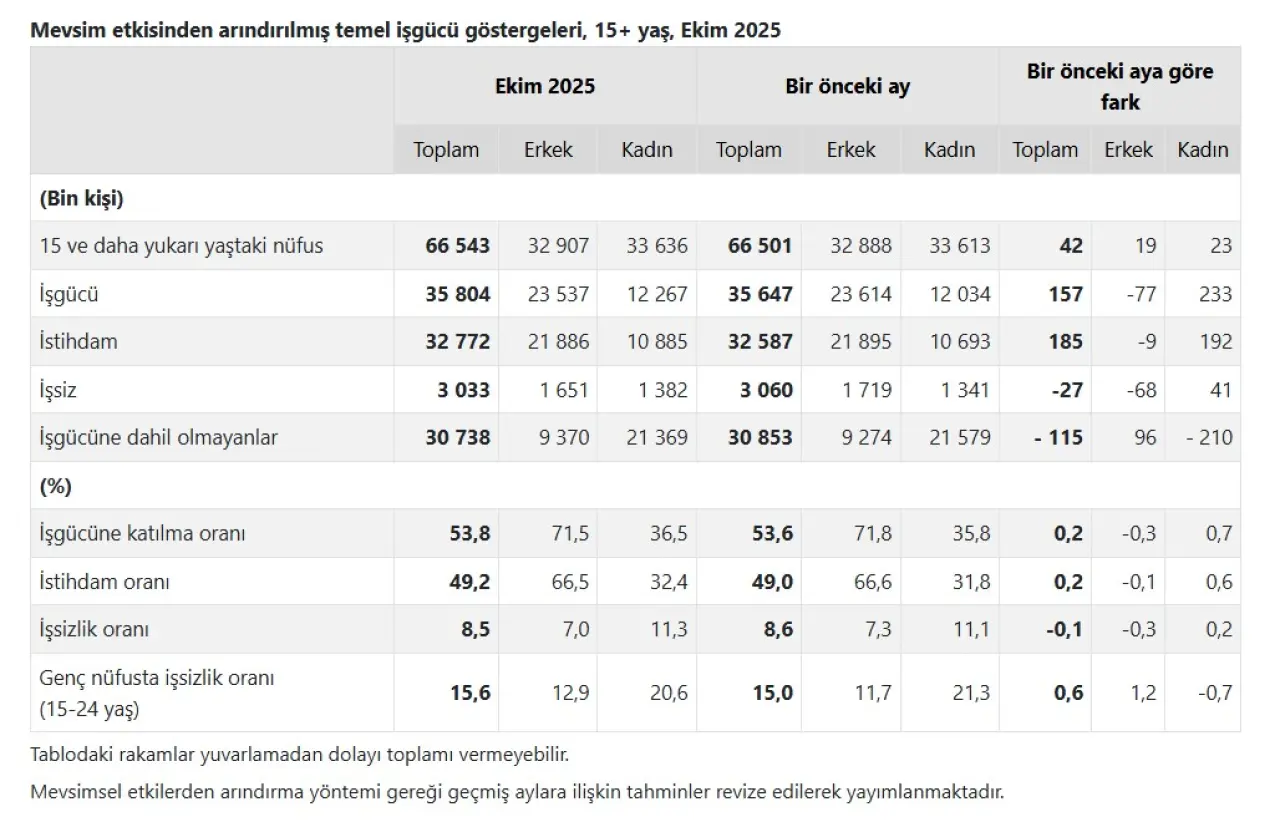 Türkiye İstatistik Kurumu (TÜİK), Ekim 2025 dönemine ilişkin mevsim etkilerinden arındırılmış işgücü verilerini açıkladı. Hanehalkı İşgücü Araştırması sonuçlarına göre işsizlik oranı bir önceki aya kıyasla 0,1 puan azalarak yüzde 8,5 seviyesine indi. Ancak geniş tanımlı işsizlik olarak bilinen atıl işgücü oranındaki artış dikkat çekti ve oran 1,1 puanlık yükselişle yüzde 29,6 seviyesine ulaştı. Ekim ayında 15 yaş ve üzeri nüfusta işsiz sayısı, bir önceki aya göre 27 bin kişi azalarak 3 milyon 33 bin kişi oldu. Cinsiyete göre dağılım şöyle gerçekleşti: