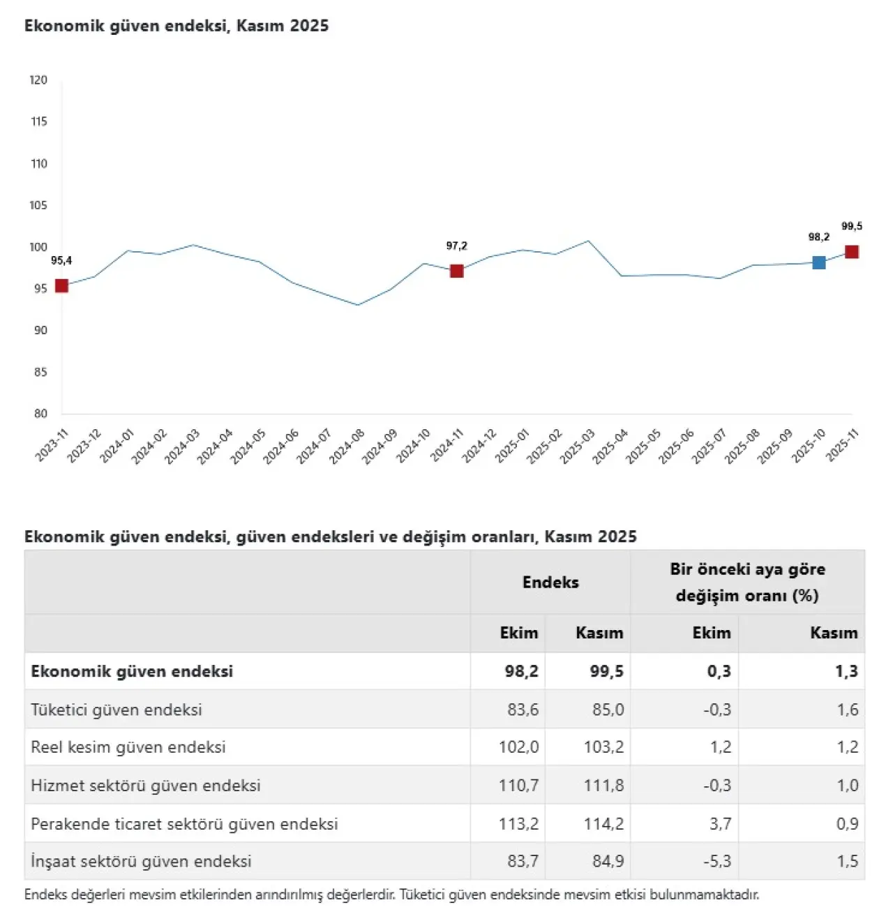 Türkiye ekonomisine ilişkin beklenti ve güven göstergelerini içeren Ekonomik Güven Endeksi, Kasım 2025’te bir önceki aya göre sınırlı bir artış kaydetti. Ekim ayında 98,2 seviyesinde olan endeks, Kasım ayında yüzde 1,3’lük yükselişle 99,5 değerine ulaşarak kritik eşik olan 100 puana yeniden yaklaştı. Bu seviye, ekonomik faaliyetlerde toparlanma beklentisinin güçlendiğine işaret ediyor. Endeksin yükselişinde en önemli katkıyı tüketici, reel kesim ve inşaat sektöründeki artışlar sağladı. Kasım ayında: