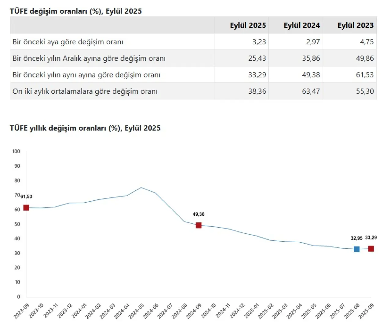 Türkiye İstatistik Kurumu (TÜİK) verilerine göre tüketici fiyat endeksi (TÜFE) Eylül 2025’te yıllık bazda %33,29, aylık bazda ise %3,23 artış gösterdi. Böylece enflasyon, yaz aylarında gözlenen yavaşlama eğilimine rağmen çift haneli seviyelerdeki seyrini sürdürdü.