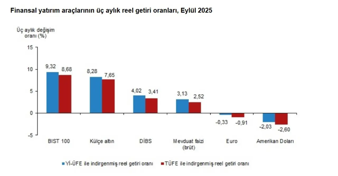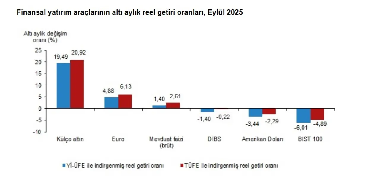 Türkiye İstatistik Kurumu (TÜİK) tarafından açıklanan Finansal Yatırım Araçlarının Reel Getiri Oranları raporuna göre, külçe altın, hem üretici hem tüketici fiyat endeksine göre en yüksek reel getiri sağlayan yatırım aracı oldu.