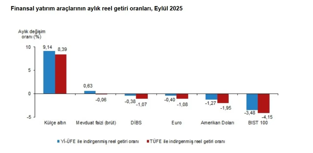 TÜİK verilerine göre, külçe altın eylülde yatırımcısına TÜFE’ye göre yüzde 8,39, Yİ-ÜFE’ye göre ise yüzde 9,14 oranında reel getiri sağladı. Altın böylece, yüksek enflasyon ortamında bile yatırımcısının alım gücünü koruyan ve artıran tek yatırım aracı olarak öne çıktı. Yatırımcılar açısından mevduat faizi (brüt) yüzde 0,63’lük reel kazançla ikinci sırada yer alırken, DİBS, euro, dolar ve Borsa İstanbul (BIST) 100 endeksi eylülde yatırımcısına kaybettirdi.