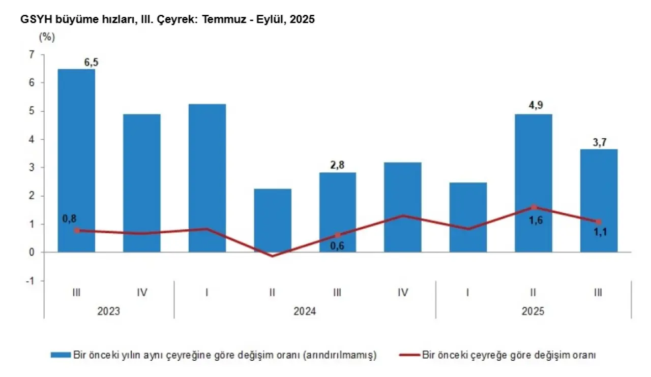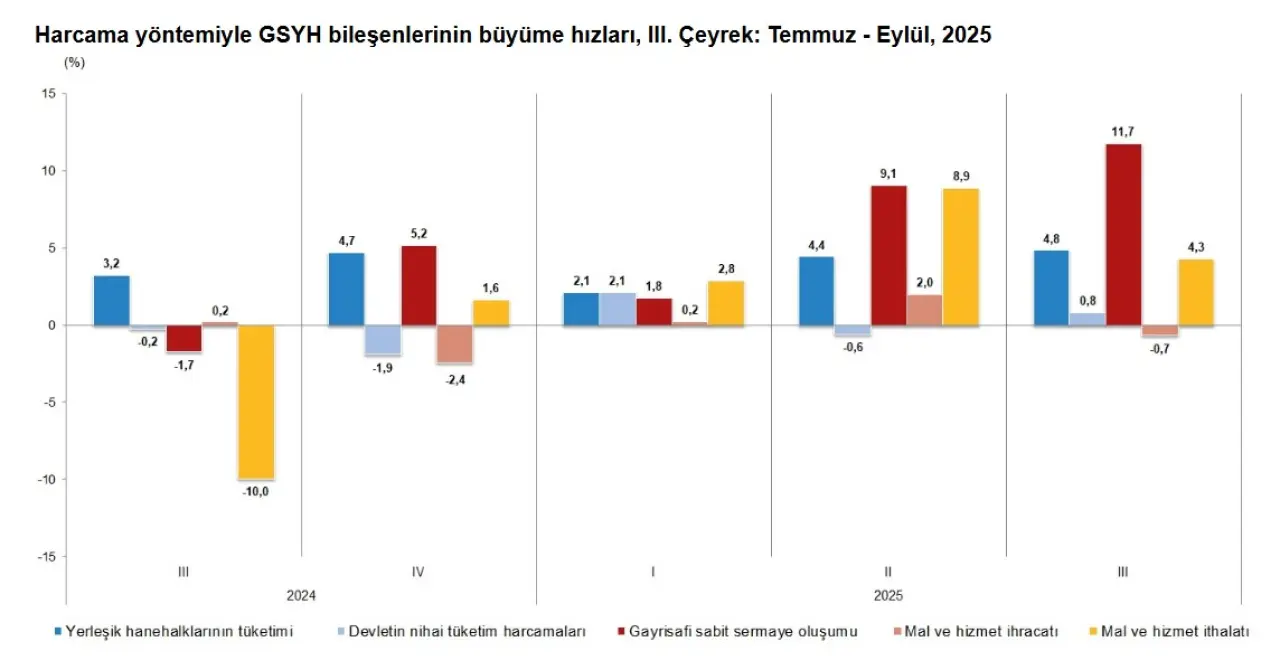 2025 yılının üçüncü çeyreği, özellikle inşaat, finans ve bilgi-iletişim gibi sektörlerdeki güçlü performansla desteklenen dengeli bir büyüme dönemi olarak kayda geçti. İç talep ve yatırımlar büyümeyi taşırken, dış ticaret tarafındaki zayıflık büyümeyi sınırlayan unsur oldu. Tarımdaki daralma ise genel görünümde aşağı yönlü bir risk oluşturdu. Bütünlüklü olarak bakıldığında Türkiye ekonomisi, küresel belirsizliklere rağmen üçüncü çeyrekte ılımlı ama istikrarlı bir büyüme profili çizdi.