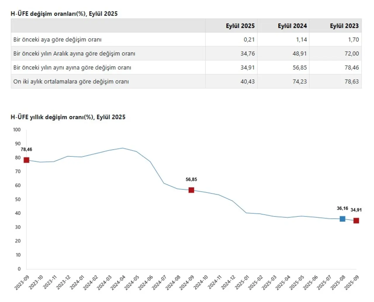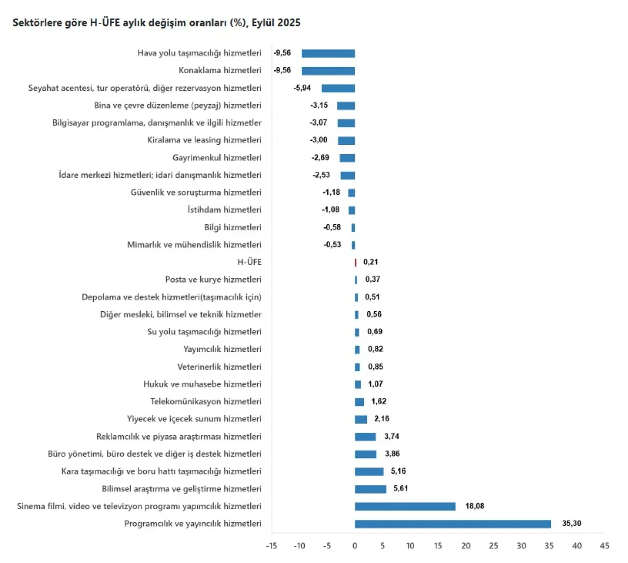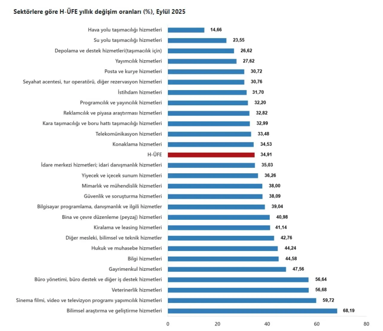 Türkiye İstatistik Kurumu (TÜİK) verilerine göre, Hizmet Üretici Fiyat Endeksi (H-ÜFE) 2025 yılının Eylül ayında yıllık bazda %34,91, aylık bazda ise %0,21 artış kaydetti. Hizmet sektörlerinde fiyat artış hızının önceki aylara göre belirgin biçimde yavaşlaması, maliyet baskılarında sınırlı bir gevşemeye işaret etti. Verilere göre H-ÜFE, bir önceki aya göre %0,21, Aralık 2024’e göre %34,76, geçen yılın aynı ayına göre %34,91, on iki aylık ortalamalara göre ise %40,43 oranında artış gösterdi. Bu oranlar, 2024 Eylül döneminde kaydedilen %56,85’lik yıllık artışın oldukça altında kalarak, hizmet fiyatlarındaki artış eğiliminin ılımlılaştığını ortaya koydu.