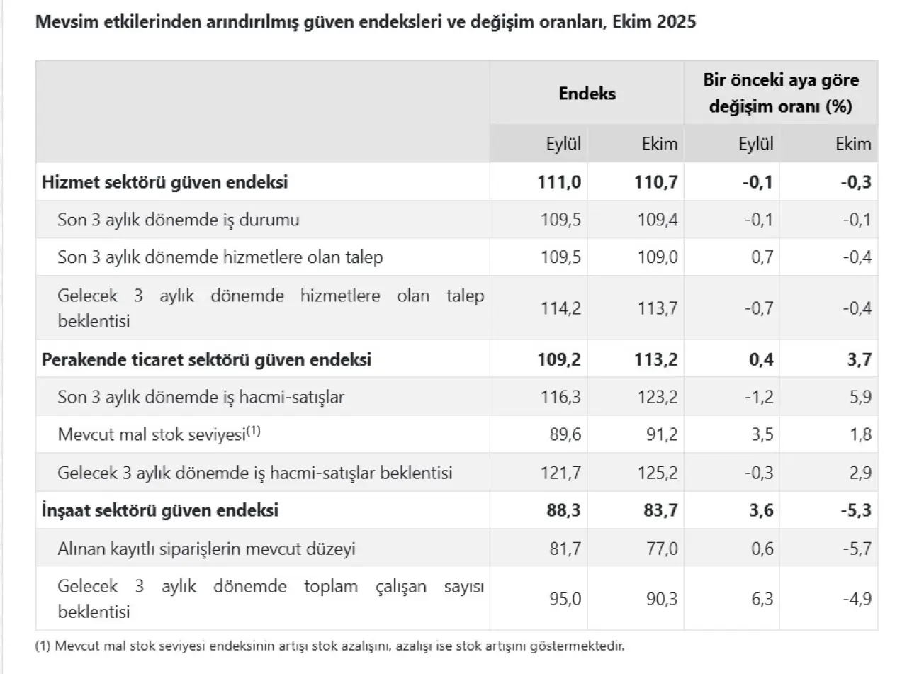 Türkiye İstatistik Kurumu’nun (TÜİK) verilerine göre, Ekim 2025 itibarıyla ekonomik güvenin sektörel dağılımında hizmet ve inşaatta gerileme, perakende ticarette ise toparlanma yaşandı. Mevsim etkilerinden arındırılmış verilere göre;