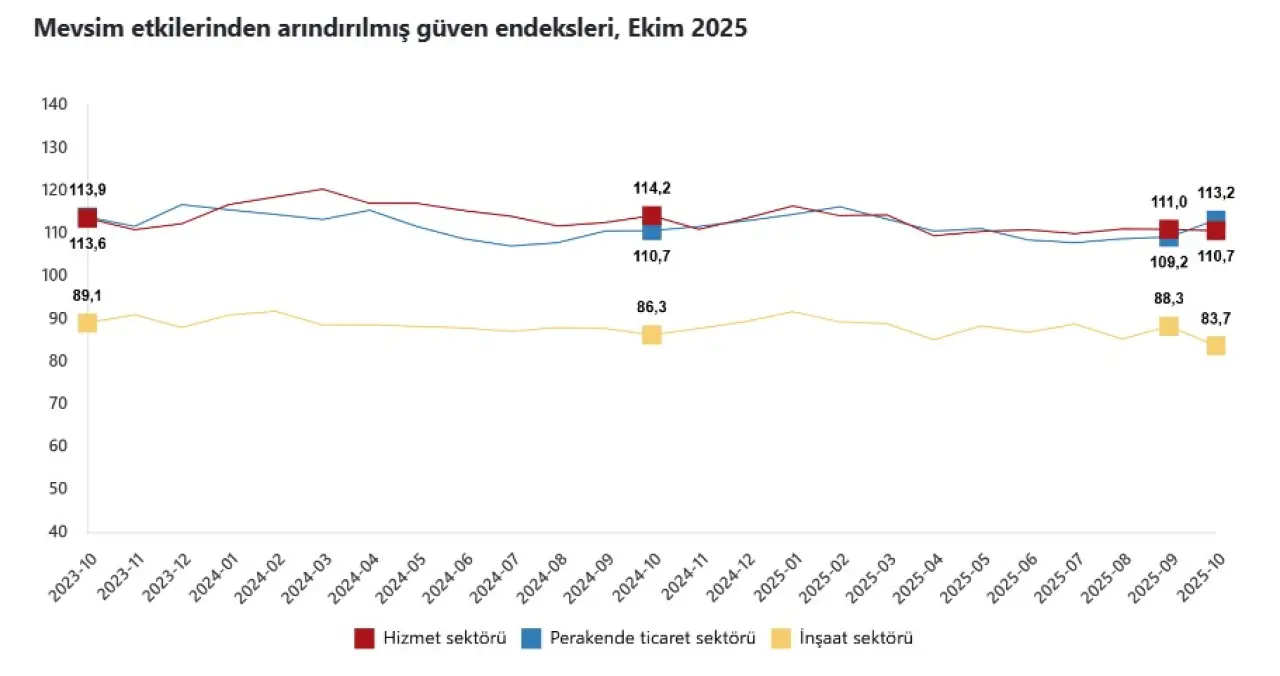 TÜİK verilerine göre, Ekim 2025’te hizmet ve inşaat sektörlerinde güven azalırken, perakende ticaret sektöründe iyimserlik yükseldi. Hizmet endeksi %0,3 düşüşle 110,7’ye, inşaat %5,3 gerilemeyle 83,7’ye inerken; perakende ticaret güveni %3,7 artışla 113,2’ye çıktı