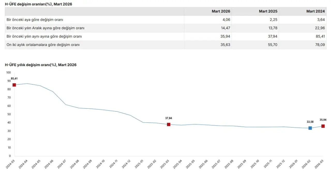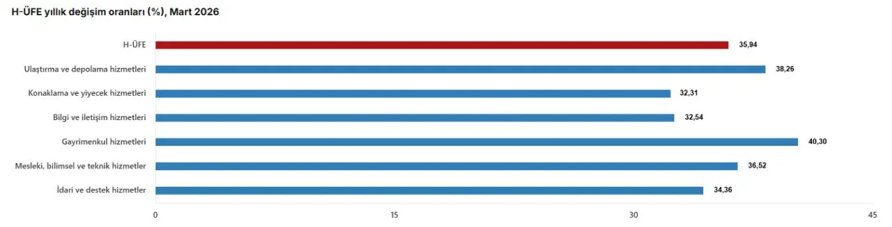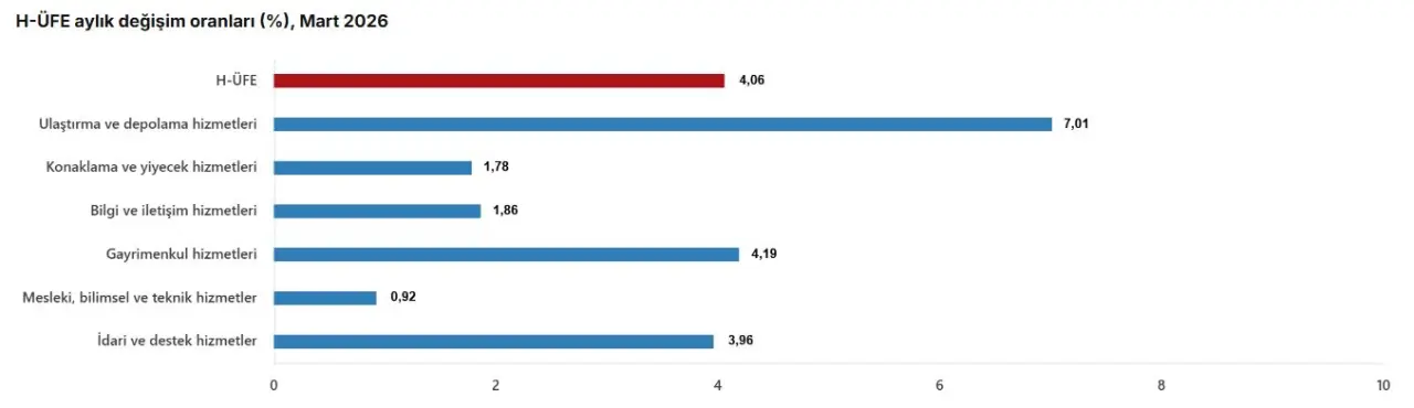 Hizmet Üretici Fiyat Endeksi (H-ÜFE), 2026 yılı Mart ayında hem aylık hem de yıllık bazda güçlü artışını sürdürerek hizmet sektöründe maliyet baskısının devam ettiğini ortaya koydu. Açıklanan verilere göre endeks, aylık %4,06, yıllık ise %35,94 oranında yükseldi. Bu tablo, özellikle ulaştırma, gayrimenkul ve profesyonel hizmetlerde maliyet geçişkenliğinin güçlü seyrettiğine işaret ediyor.