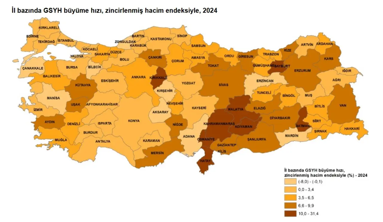 Türkiye ekonomisi 2024’te zincirlenmiş hacim endeksine göre %3,3 büyürken, 46 ilin bu ortalamanın üzerinde büyüme kaydetmesi dikkat çekti. En yüksek büyüme oranına sahip iller: