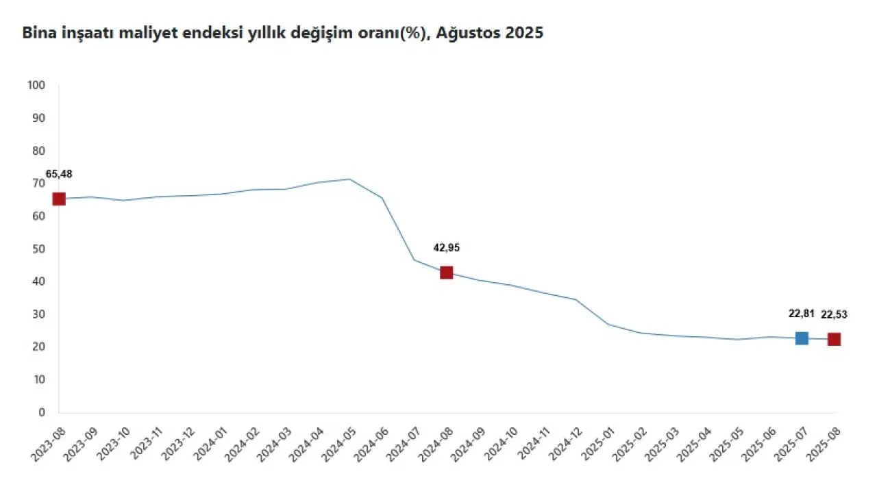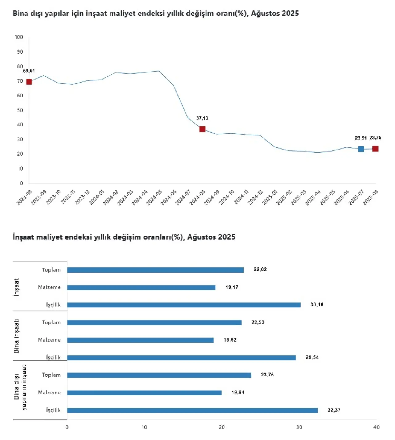 Bina inşaatına ilişkin endeks, ağustosta aylık %1,15, yıllık %22,53 yükseldi. Bina yapımında kullanılan malzeme fiyatları aylık %1,67, işçilik maliyetleri %0,23 oranında arttı. Yıllık bazda ise malzeme fiyatlarında %18,92, işçilikte ise %29,54 artış kaydedildi. Uzmanlara göre, konut sektöründeki yavaşlama ve kredi kısıtları maliyet artışlarını sınırlarken, nitelikli iş gücü açığı fiyatların düşmesini engelliyor. Yol, köprü, enerji ve altyapı yatırımlarını kapsayan bina dışı yapılar için inşaat maliyet endeksi aylık %0,72, yıllık ise %23,75 arttı.