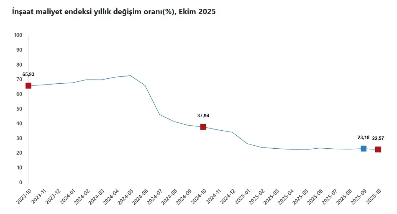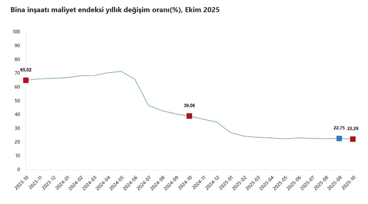 Ekim ayında bina inşaatı maliyet endeksi aylık bazda %0,95, yıllık bazda %22,29 artış gösterdi. Alt kalemlerde ise: