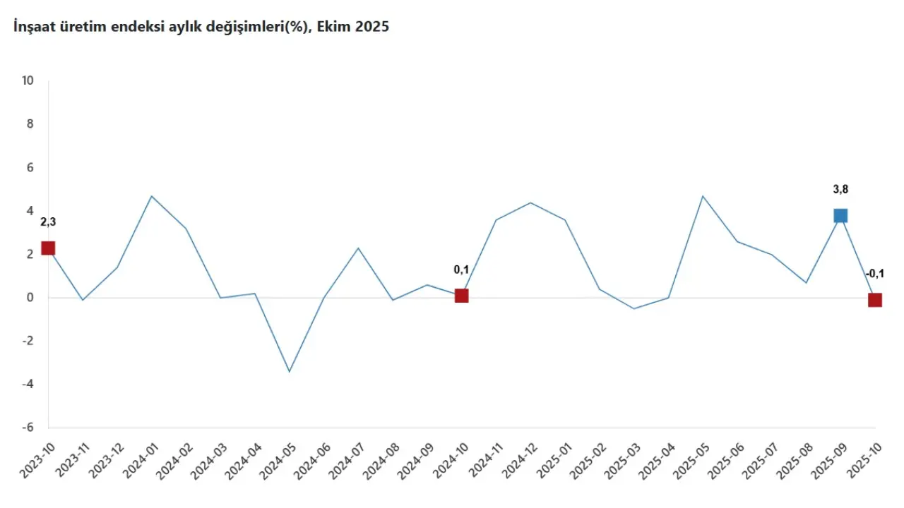İnşaat üretimi, Ekim ayında bir önceki aya göre yüzde 0,1 azaldı. Mevsim ve takvim etkilerinden arındırılmış bu veri, sektörün kısa vadede dengelenme sürecine girdiğini gösteriyor. Alt sektörlerin aylık performansı ise farklı yönlerde seyretti: