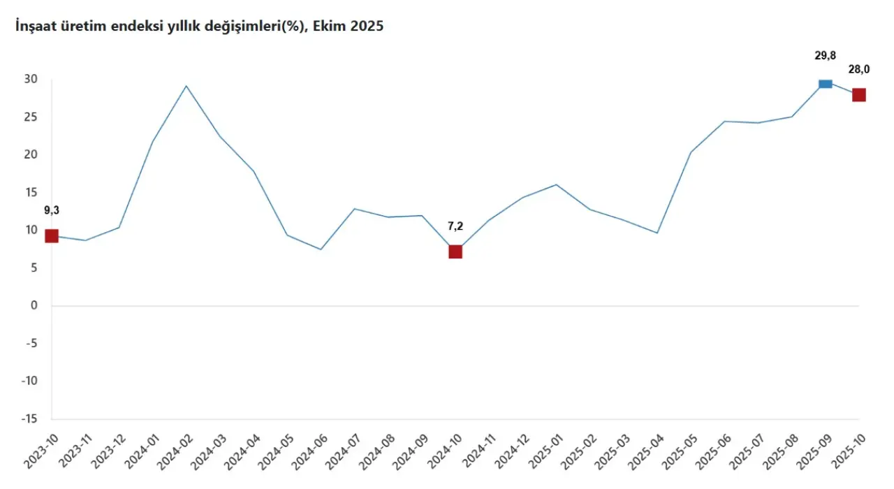 İnşaat sektöründe yıllık bazda güçlü büyüme sürerken, kısa vadede ivme kaybına işaret eden bir görünüm ortaya çıktı. 2025 yılı Ekim ayına ilişkin İnşaat Üretim Endeksi verileri, sektörün yıllık ölçekte yüksek performansını koruduğunu ancak aylık bazda sınırlı bir gerileme yaşandığını gösterdi. 2021=100 referans yıllı İnşaat Üretim Endeksi, Ekim 2025’te geçen yılın aynı ayına göre yüzde 28,0 arttı. Bu artış, deprem sonrası yeniden yapılanma, kentsel dönüşüm çalışmaları ve kamu–özel sektör yatırımlarının inşaat faaliyetlerini güçlü biçimde desteklediğini ortaya koydu.