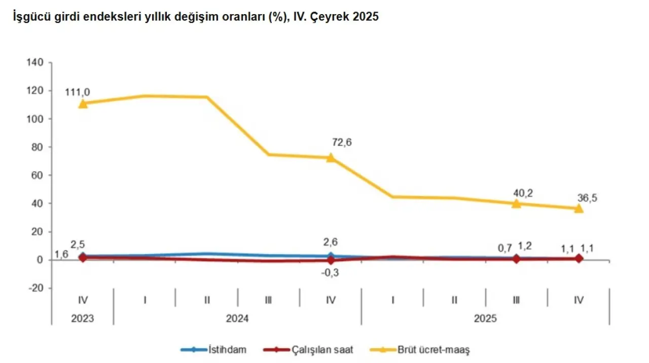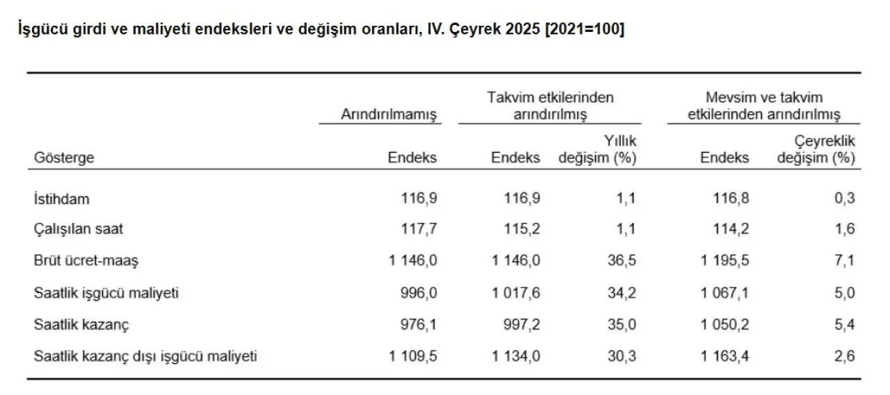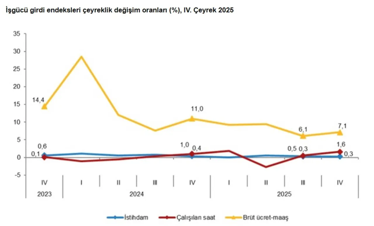 2025 yılının son çeyreğinde işgücü piyasasında karma bir görünüm ortaya çıktı. Sanayi tarafında istihdam ve çalışılan saatlerde daralma sürerken, inşaat ve hizmet sektörlerindeki artış toplam endeksleri yukarı taşıdı. Ücret ve işgücü maliyeti göstergelerinde ise güçlü artış eğilimi dikkat çekti.