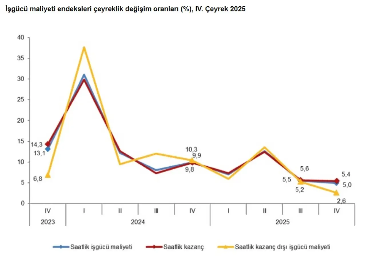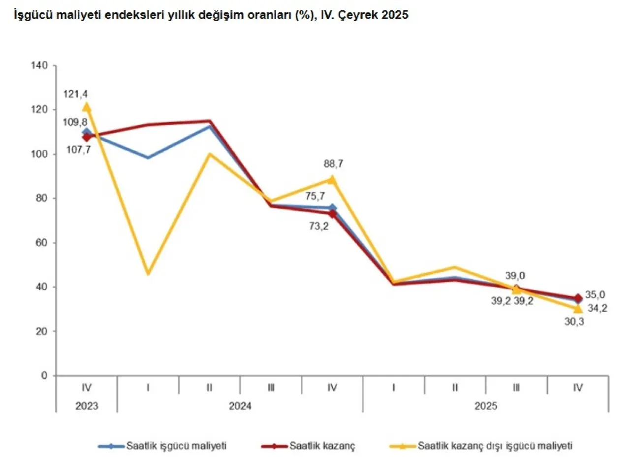 Saatlik kazanç endeksi %35,0 yükselirken, kazanç dışı işgücü maliyeti %30,3 arttı. Çeyreklik bazda ise:
