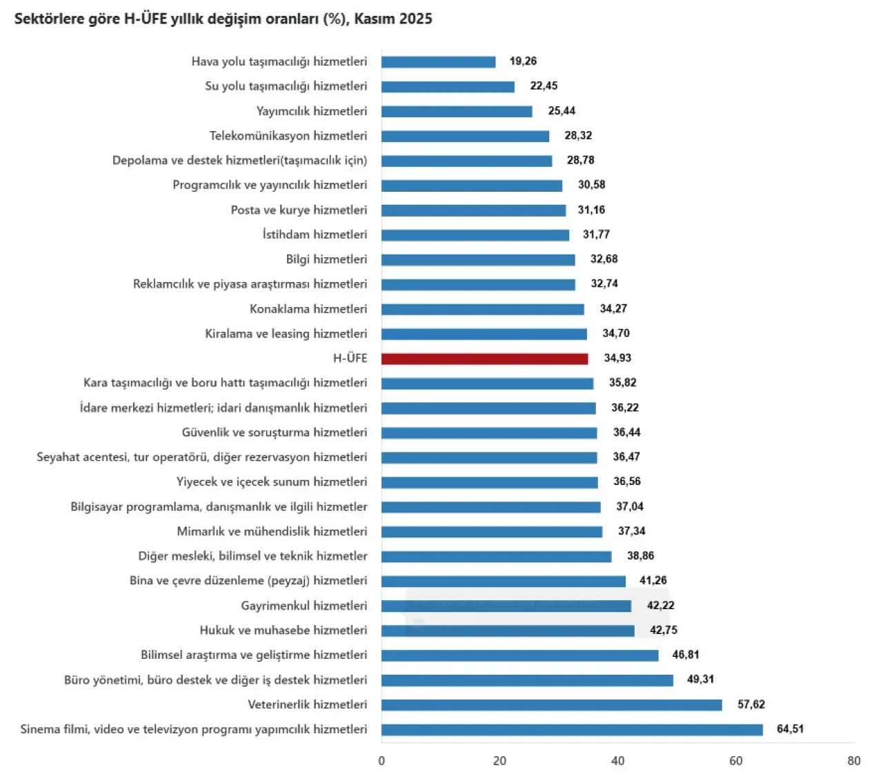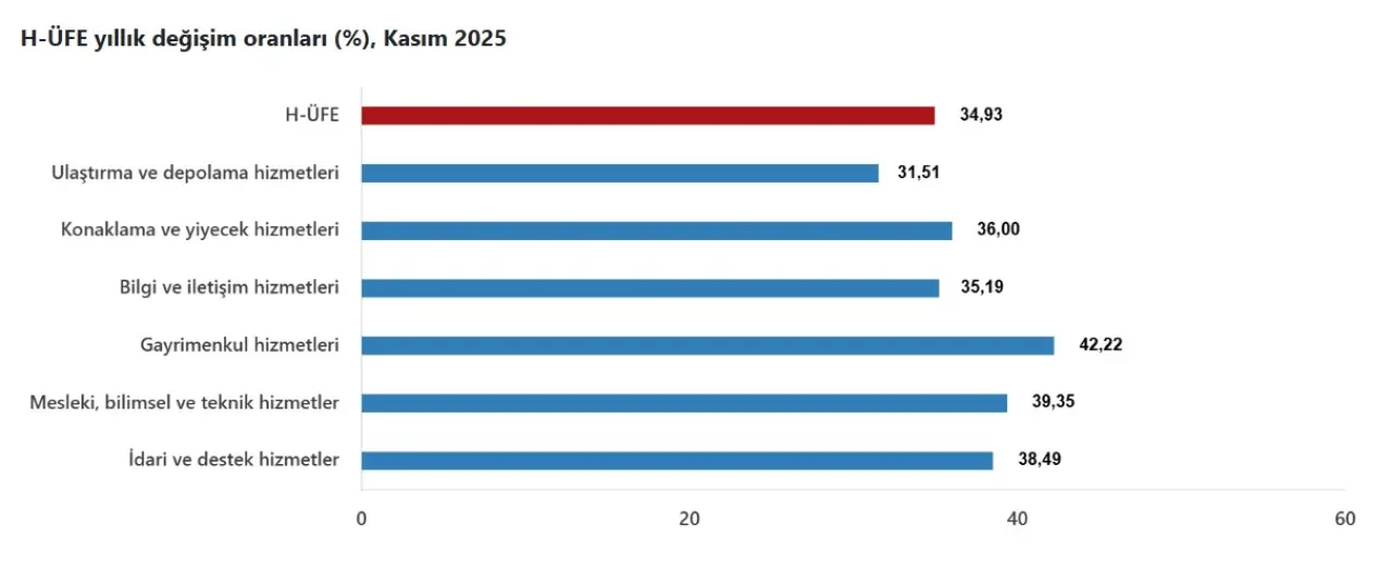 Hizmet sektöründeki maliyet eğilimini ortaya koyan Hizmet Üretici Fiyat Endeksi (H-ÜFE), Kasım 2025 verileriyle aylık bazda düşüşe işaret ederken yıllık artışını sürdürdü. Türkiye İstatistik Kurumu (TÜİK) tarafından açıklanan verilere göre H-ÜFE, kasım ayında bir önceki aya göre yüzde 0,70 azaldı, bir önceki yılın aynı ayına göre ise yüzde 34,93 arttı. Veriler, hizmet sektöründe aylık bazda sınırlı bir rahatlamaya işaret ederken, yıllık bazda fiyat baskısının yüksek seyrini koruduğunu ortaya koydu.