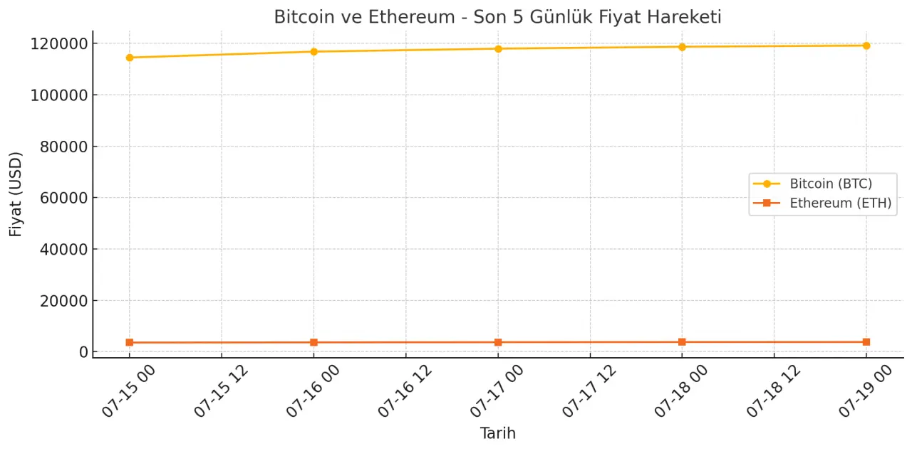 21 Temmuz 2025 itibarıyla kripto para piyasaları haftaya pozitif bir atmosferle girdi. Bitcoin ve Ethereum başta olmak üzere birçok majör kripto varlık, yatırımcıların artan ilgisi ve kurumsal desteklerle birlikte yukarı yönlü hareketini sürdürüyor.