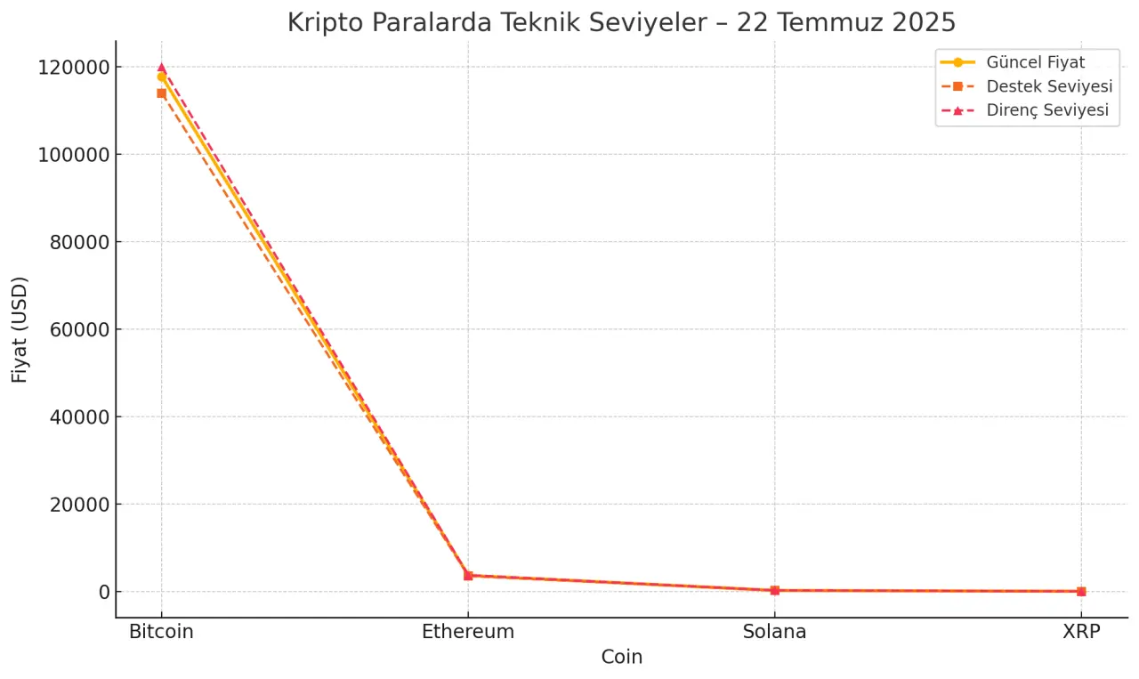 Son haftalarda yaşanan dalgalanmaların ardından Bitcoin, 118.000 dolar civarındaki dar bantta tutunmaya çalışıyor. Teknik analistlere göre BTC’nin 120.000 dolar seviyesini kırması için hacimli bir alıma ihtiyaç var. Aksi takdirde fiyat 114.000–116.000 dolar bandına doğru geri çekilme riski taşıyor. Ethereum ise 3.600 dolar bandında güç kazanmaya çalışıyor. 3.700 dolar seviyesi teknik olarak önemli bir direnç noktası olarak öne çıkarken, yatırımcıların gözü bu seviyenin kırılıp kırılmayacağında.