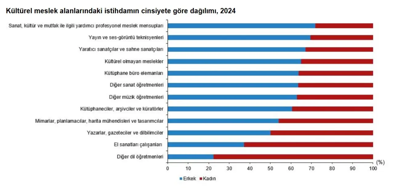 Kültürel istihdam 2024 yılında yüzde 6,5 artarak 957 bin kişiye yükseldi. Kültür sektörünün toplam istihdam içindeki payı yüzde 2,9 olarak kaydedildi. Demografik görünüm ise oldukça dengeli:
